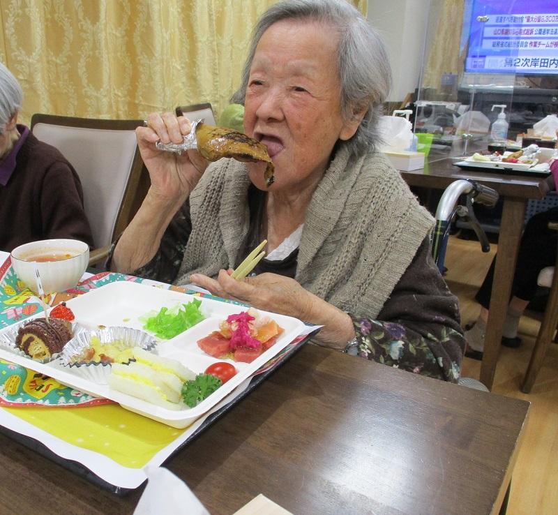 今年もクリスマスディナーを開催しました。毎年この日のメニューは一ボリューム満点!メインは大きなチキン!!食べ応えのある大きさに、皆さん「食べられるかしら?」なんて言っていましたが、大きな口を開けてペロリと美味しそうに召し上がっていました。