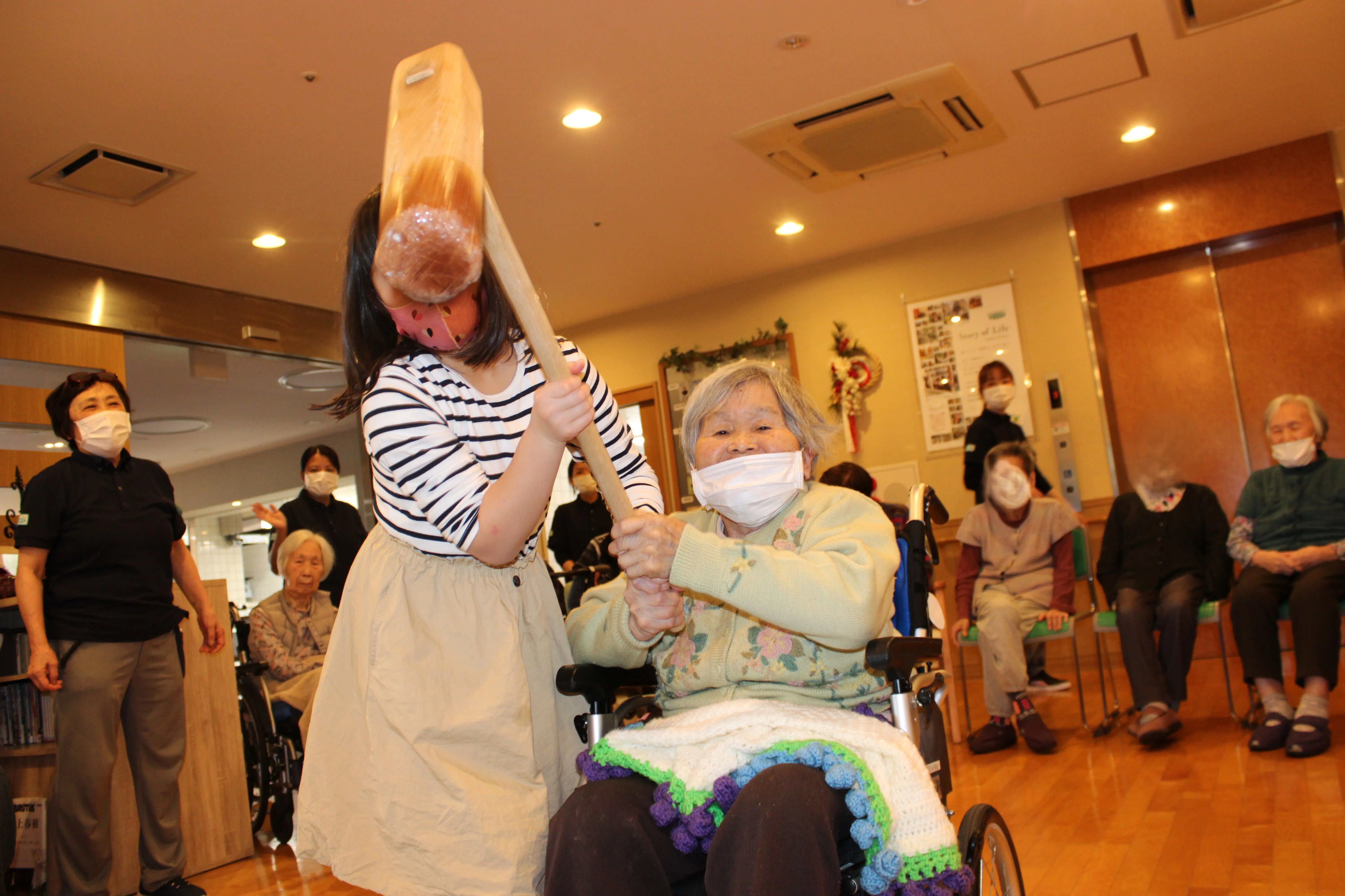 「よいしょー」「よいしょー」と大きな掛け声で、お客様とスタッフが協力をしてお餅をついていきました。