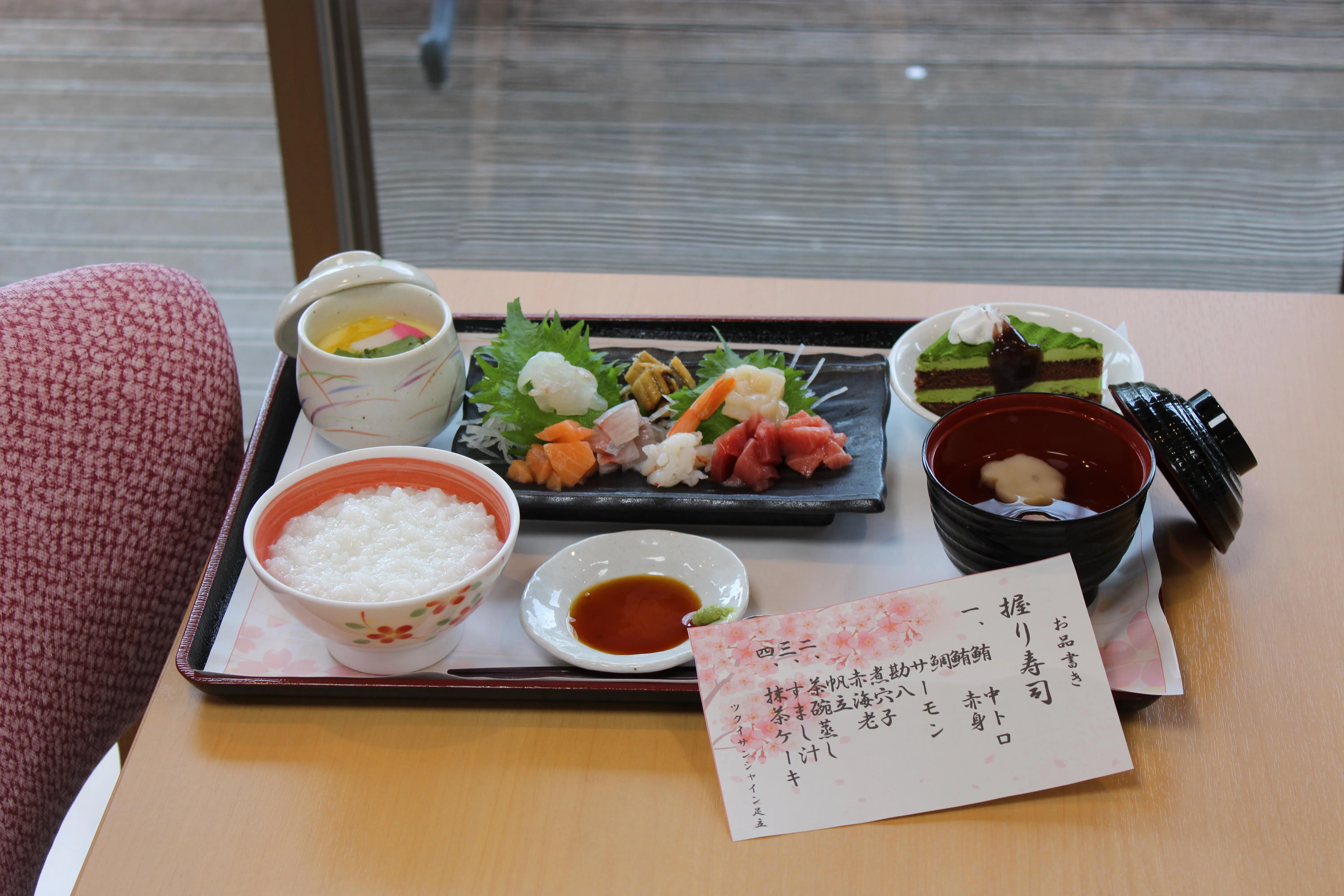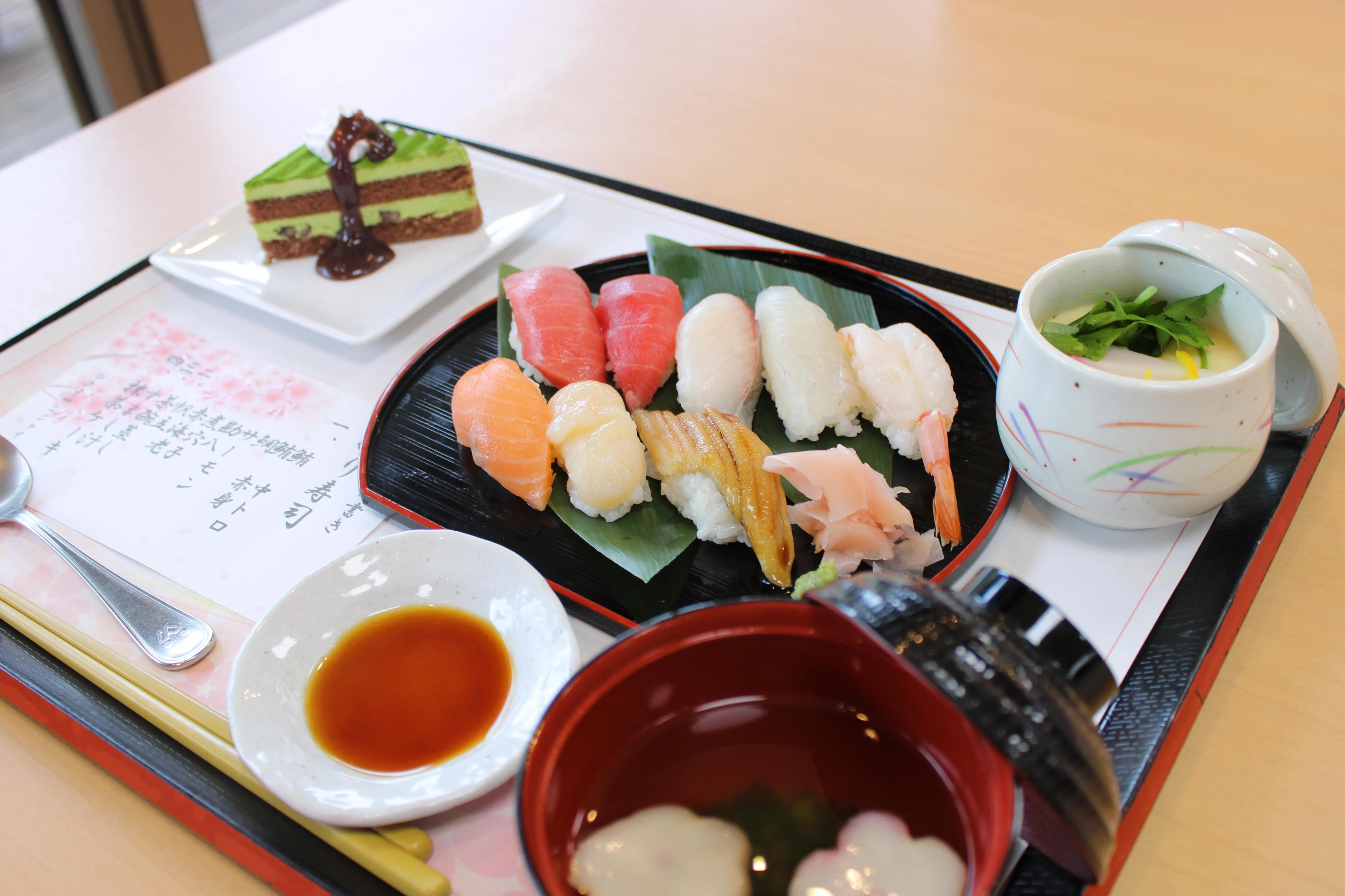 鮪中とろ、鮪赤身、鯛、サーモン、勘八、煮穴子、赤海老、帆立、茶碗蒸し、すまし汁、抹茶ケーキ