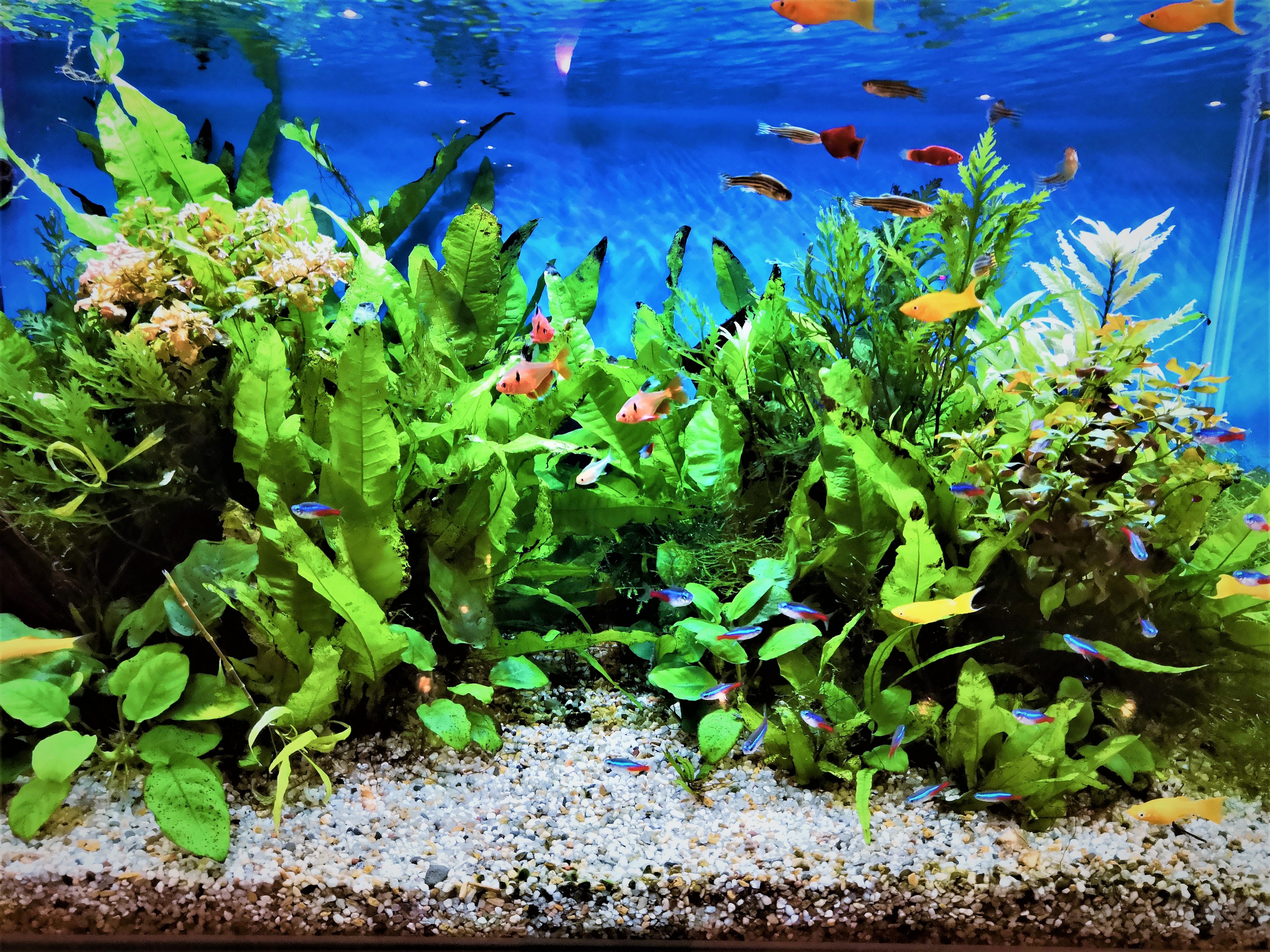 ネオンテトラ、プラティ、オレンジモーリーコリドラス、アルジイーター、ヤマトヌマエビセブラダニオ、キャリスタス、ホワイトモーリーお腹を空かせて待ってます。