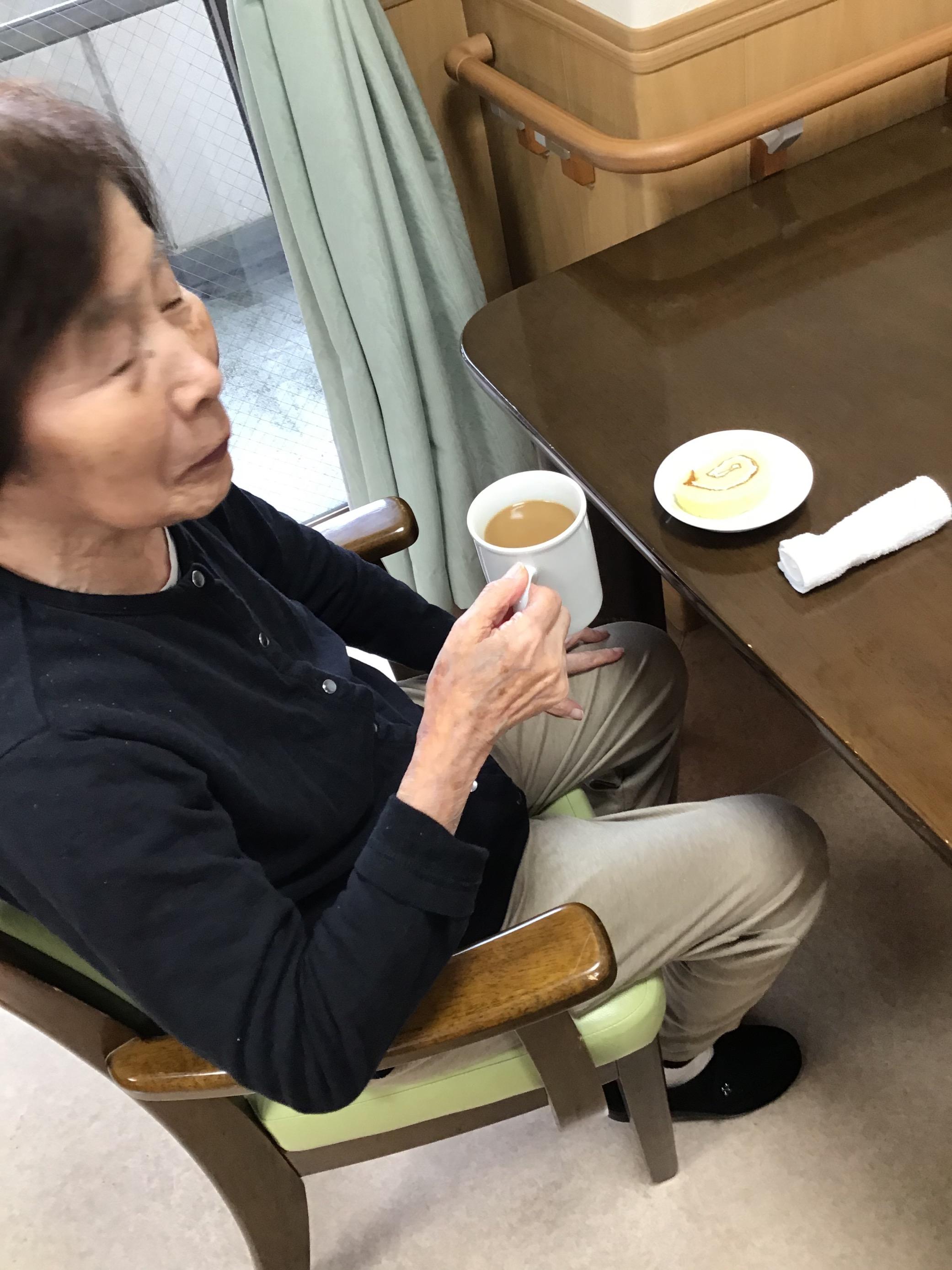 今日のおやつはロールケーキ、皆さん甘いものには、満面な笑顔です。「一緒に、仲良く食べましょ」おやつの時間は、いつでも楽しみですね!