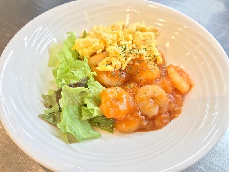 昨晩のエビチリ卵について、お客様から聞かれました。エビを焼いている間に、卵をグルグルし、チリソースに和えたエビの横に添えるのも、全部ここでやってるんですよ。嚥下食も同じ材料で作ってるんですよ。「へぇー。」ご納得いただけたようです。