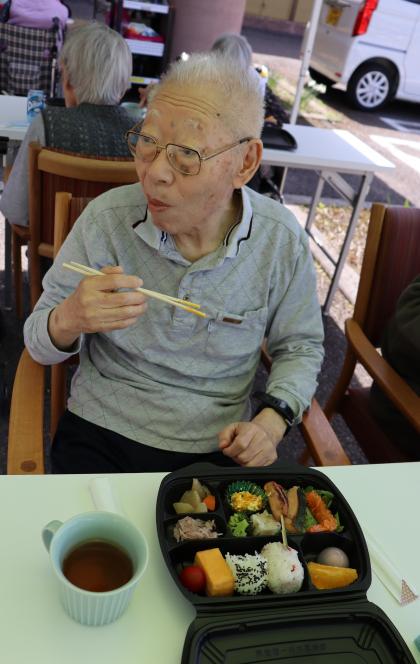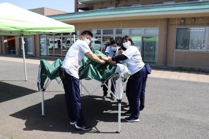 本当に久しぶりに、外気浴も兼ねて施設内の駐車場でピクニック気分を味わっていただこうと、スタッフも楽しみながら準備に取り掛かりました。気温も26℃に上昇するという天気予報のもと、テント張りに張り切っています!