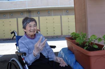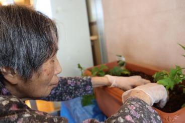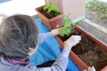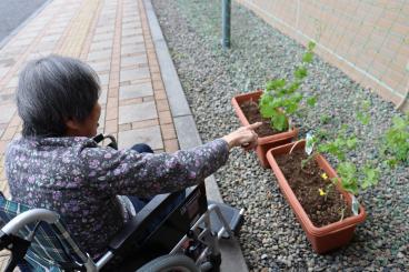 機能訓練の一環で、過去に畑仕事や花壇をやられていた方を中心にお誘いし、ゴーヤの苗植えを行いました。