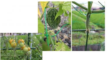 グリーンカーテンのゴーヤにも、小さい実が育っています。