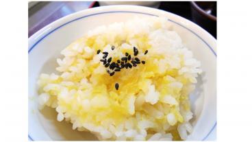 ご飯はほくほくのサツマイモを一緒に炊き込みました。ほんのりした甘さにごま塩がとても合うんですよ。