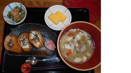 以外に豚汁との相性がいいお寿司。今回は厨房で一工夫。おいなりさん仕立てのチラシ寿司です。
