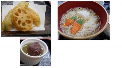 お澄まし仕立てにした「うどん」。天ぷらは「なんきん、れんこん、いんげん」の盛り合わせ。甘味は「抹茶かんてん小倉あん添え」です。