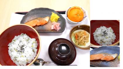 昨年までは3時のお茶と共に召し上がっていただいていた「七草がゆ」を、今年は昼食で召し上がっていただきました。お粥を引き立てる副菜は、脂ののった鮭です。程よい塩気がお粥のおいしさをより引き立てます。