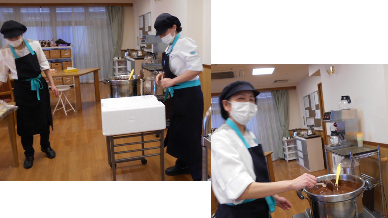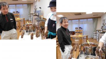 皮をむき、割り箸に刺したバナナにチョコレートを手際よくかけてゆきます。