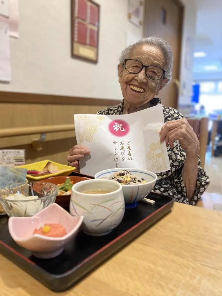 9月19日に敬老を祝う会を行いました。昼食は特別メニューでお赤飯、てんぷら、会津地方の郷土料理の「こづゆ」。節目の方には表彰とデザートプレートのプレゼントをいたしました。デザートはご家族と一緒に召し上がって頂きました。皆さまこれからも元気にお過ごし下さい。