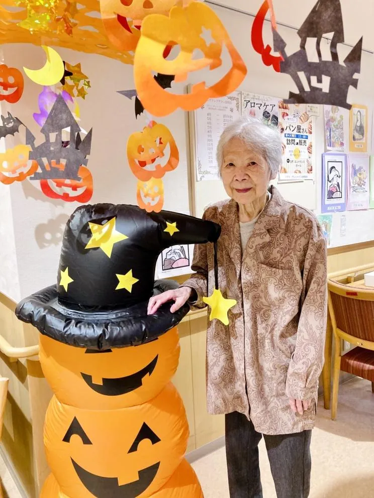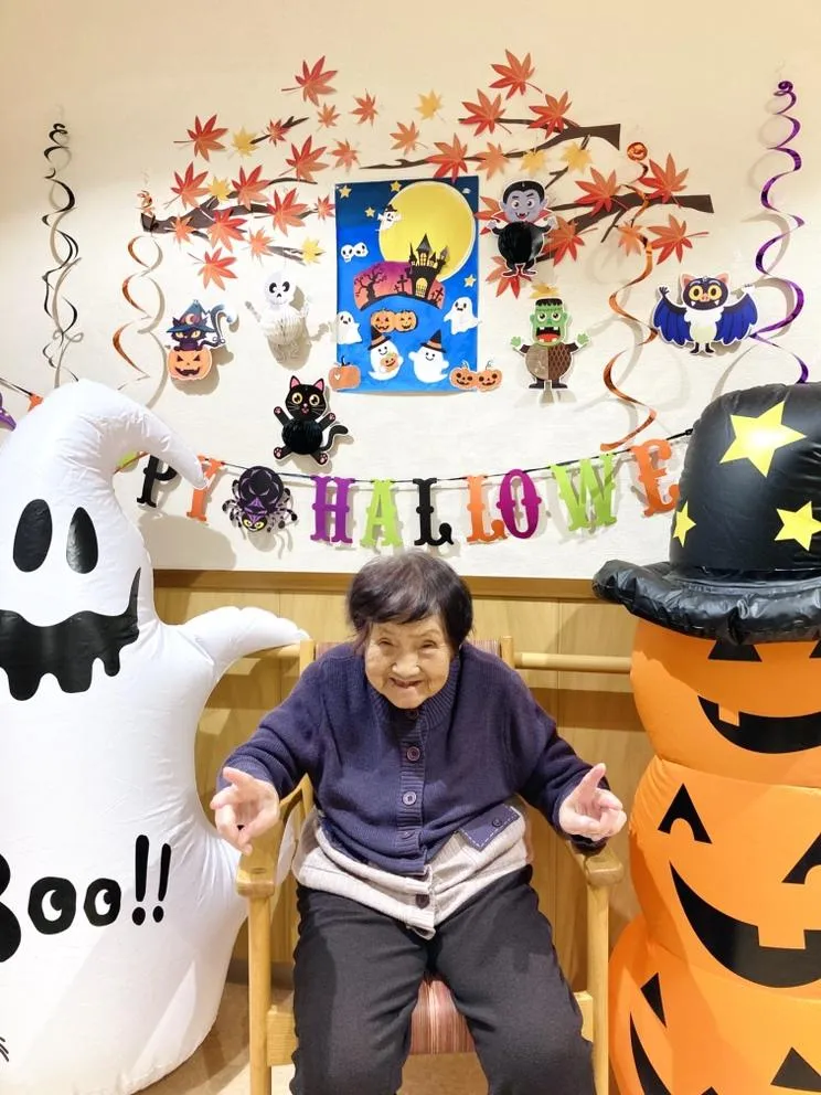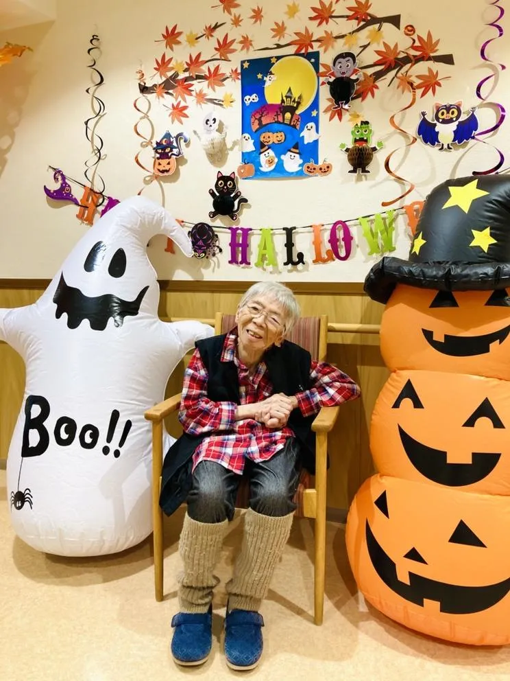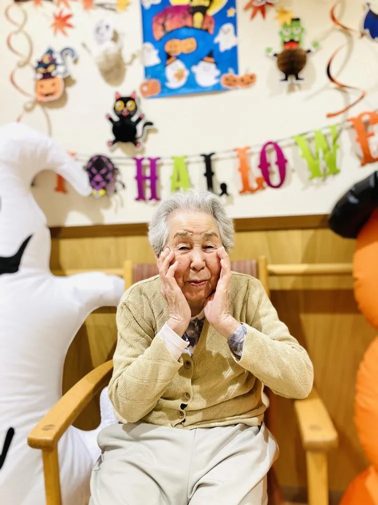 ハロウィンの飾りつけをし、飾りのまえで記念撮影。皆さま素敵な笑顔です‼
