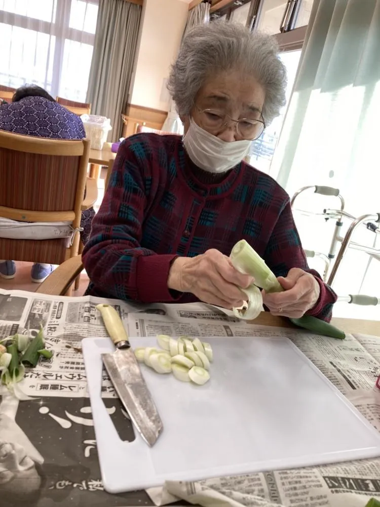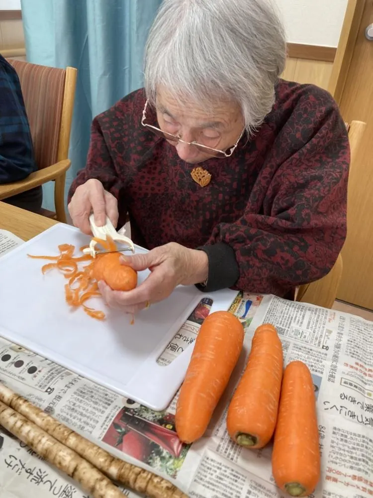 お誕生日会に豚汁を作りました。野菜を切っていただき美味しい豚汁ができました!
