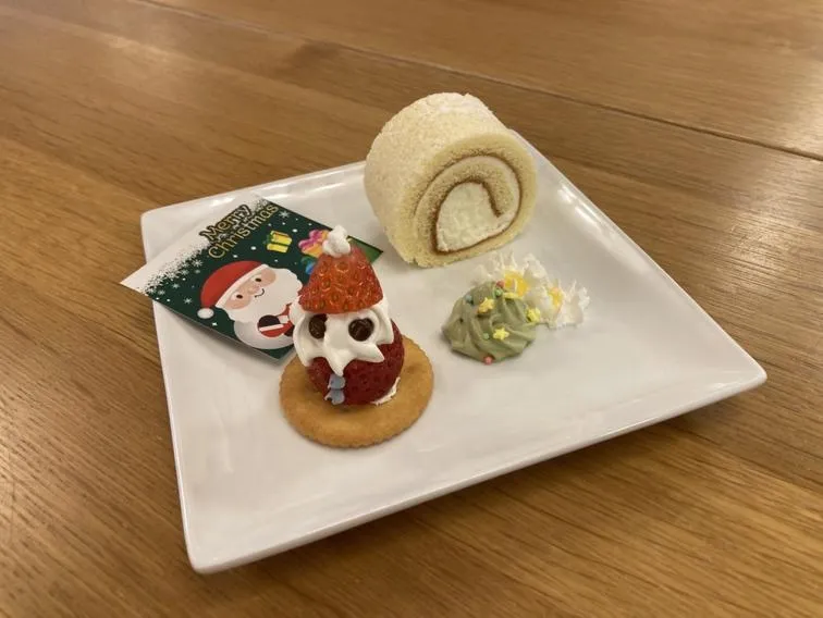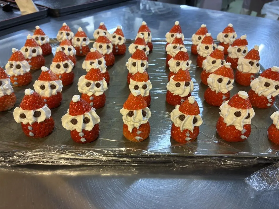 クリスマスはイチゴのサンタクロースがお目見えします。準備中のプレートは出番前のサンタがいっぱい。クリームのもみの木とロールケーキと一緒にお客様のデザートプレートが完成しました。