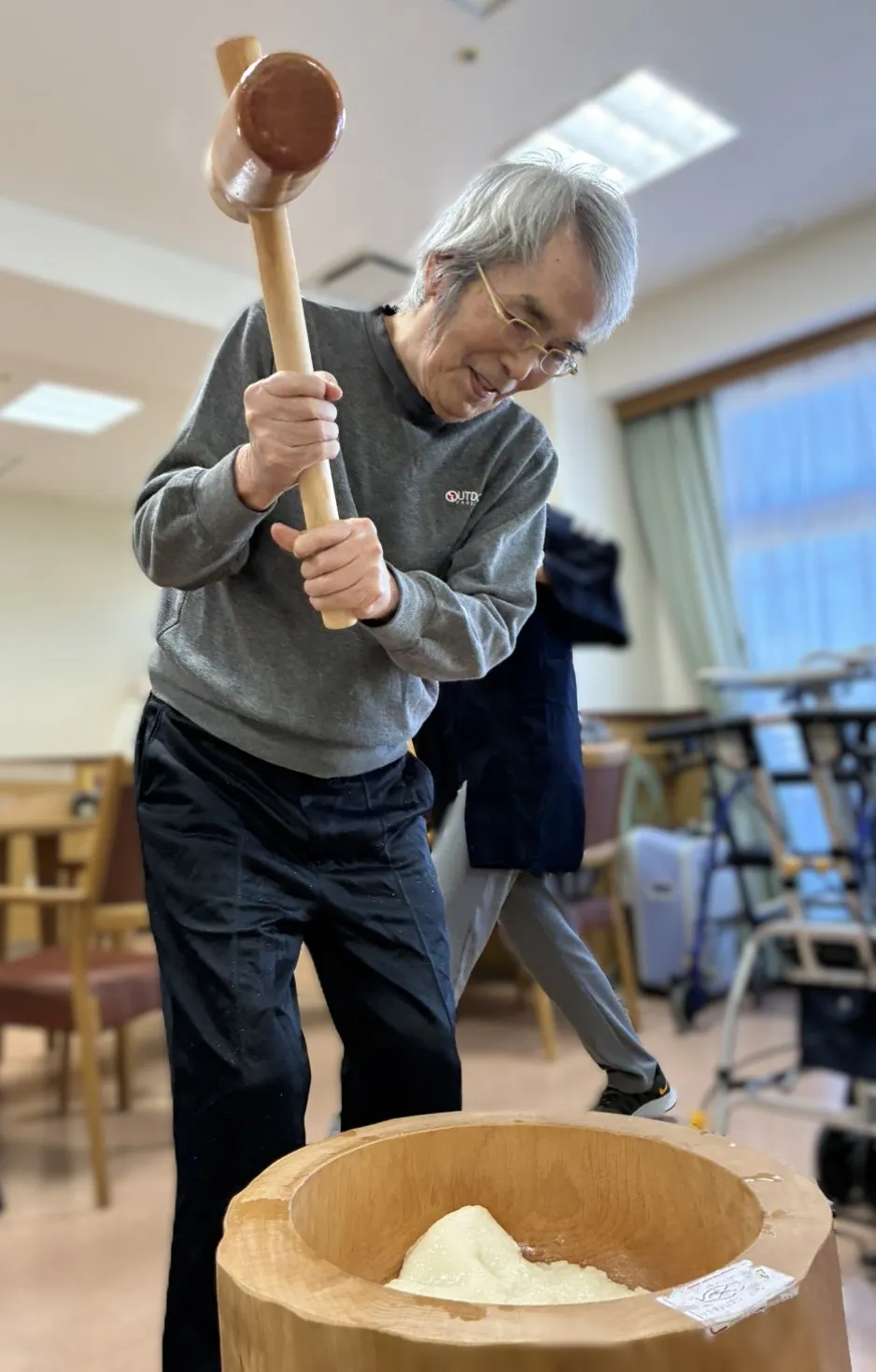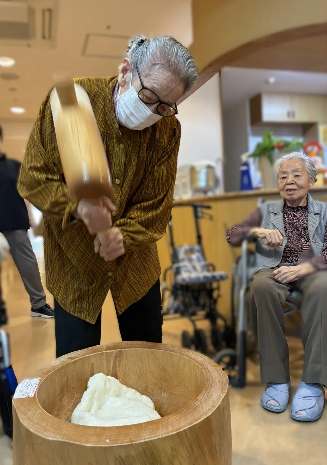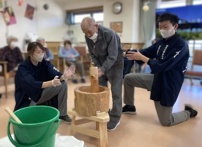 12月28日に年末の餅つきを行いました。小さめの臼と杵で「よいしょ」と掛け声をかけながらお一人おひとりついていただきました。出来上がったお餅は鏡餅にしました。