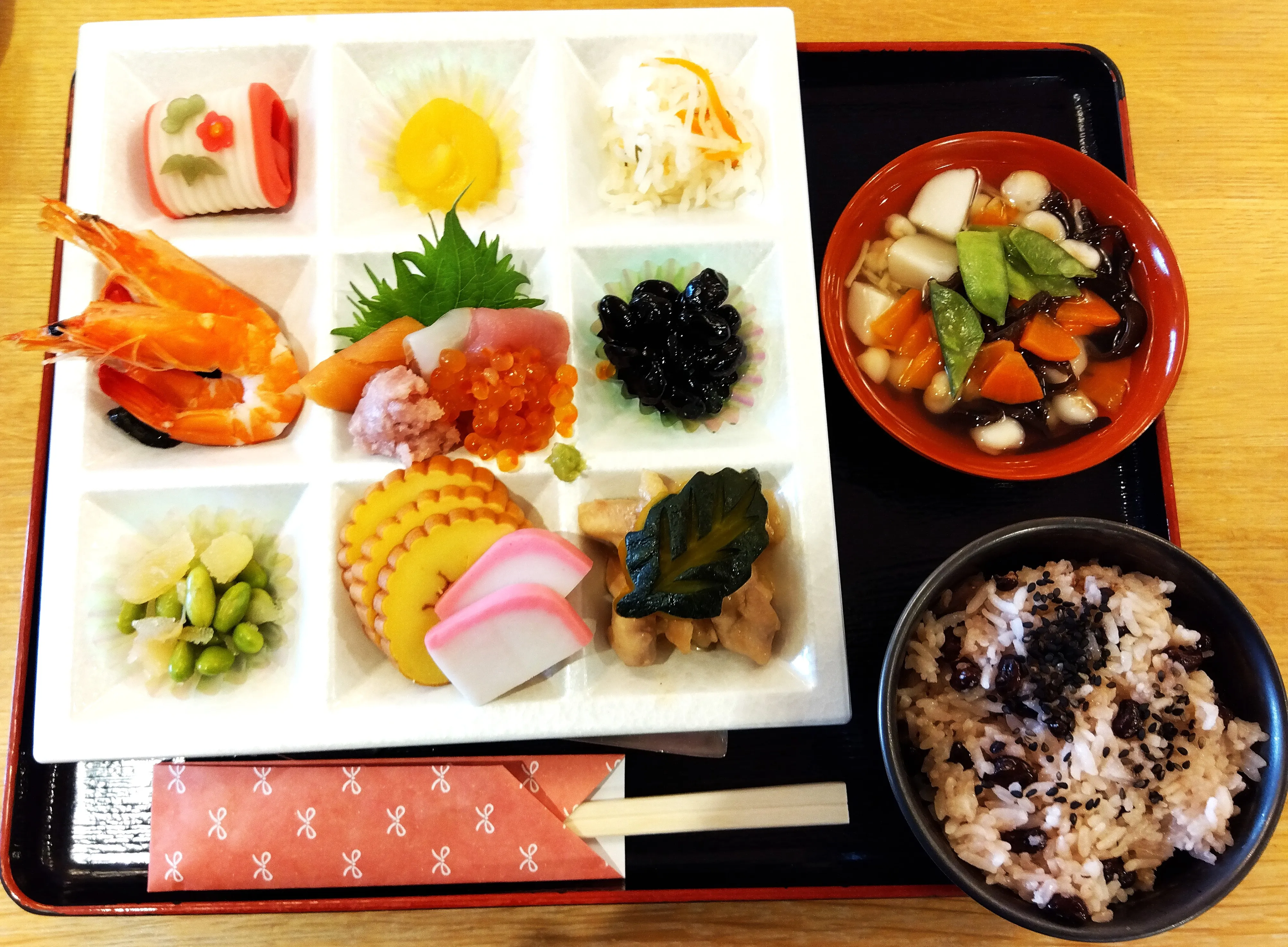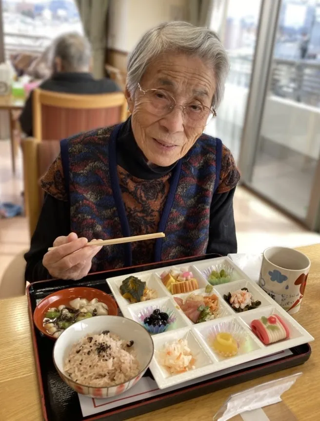 明けましておめでとうございます。今年の会津は雪もなく過ごしやすいお正月でした。元旦の昼食にはお赤飯と会津の郷土料理のこづゆがついたおせち料理を召し上がっていただきました。本年もよろしくお願いいたします。