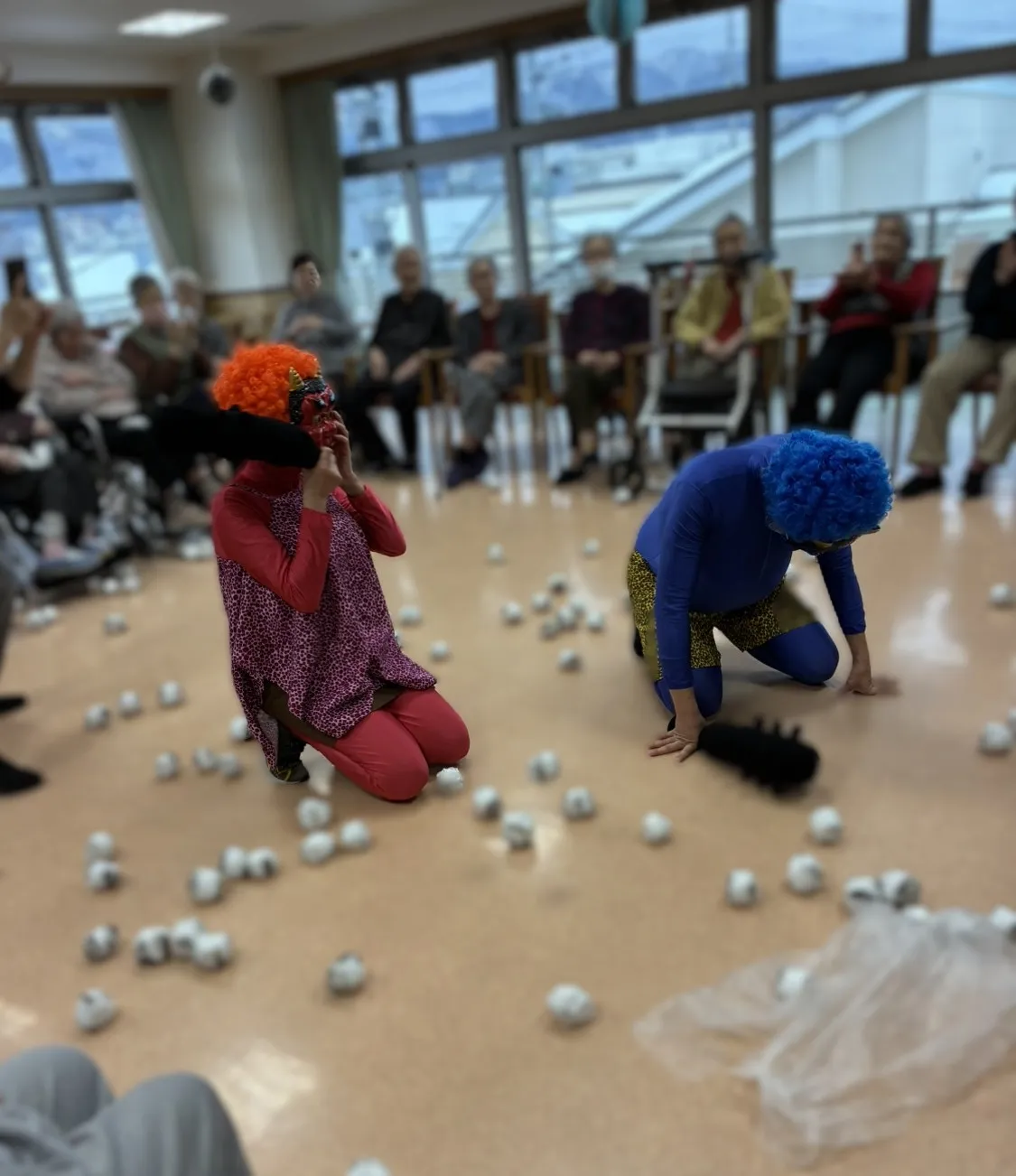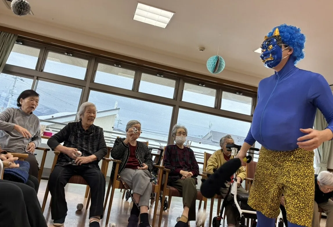 2月3日、豆まきを行いました。赤鬼と青鬼に扮したスタッフに、「鬼は外、福は内」と掛け声をかけながら豆(新聞紙を丸めた玉)を投げられました。普段は控えめな方も力いっぱい投げられ、鬼を成敗されました。おやつは、鬼の羊羹を召し上がって頂きました。今年も福が来ますように。