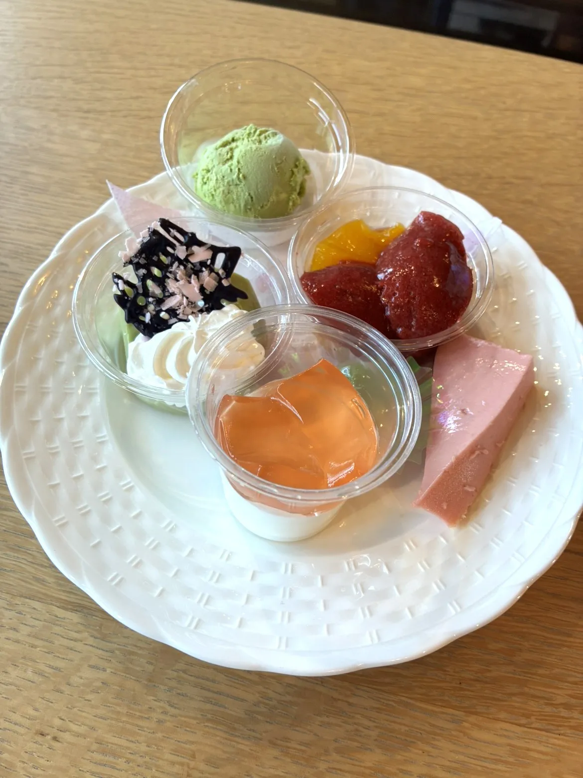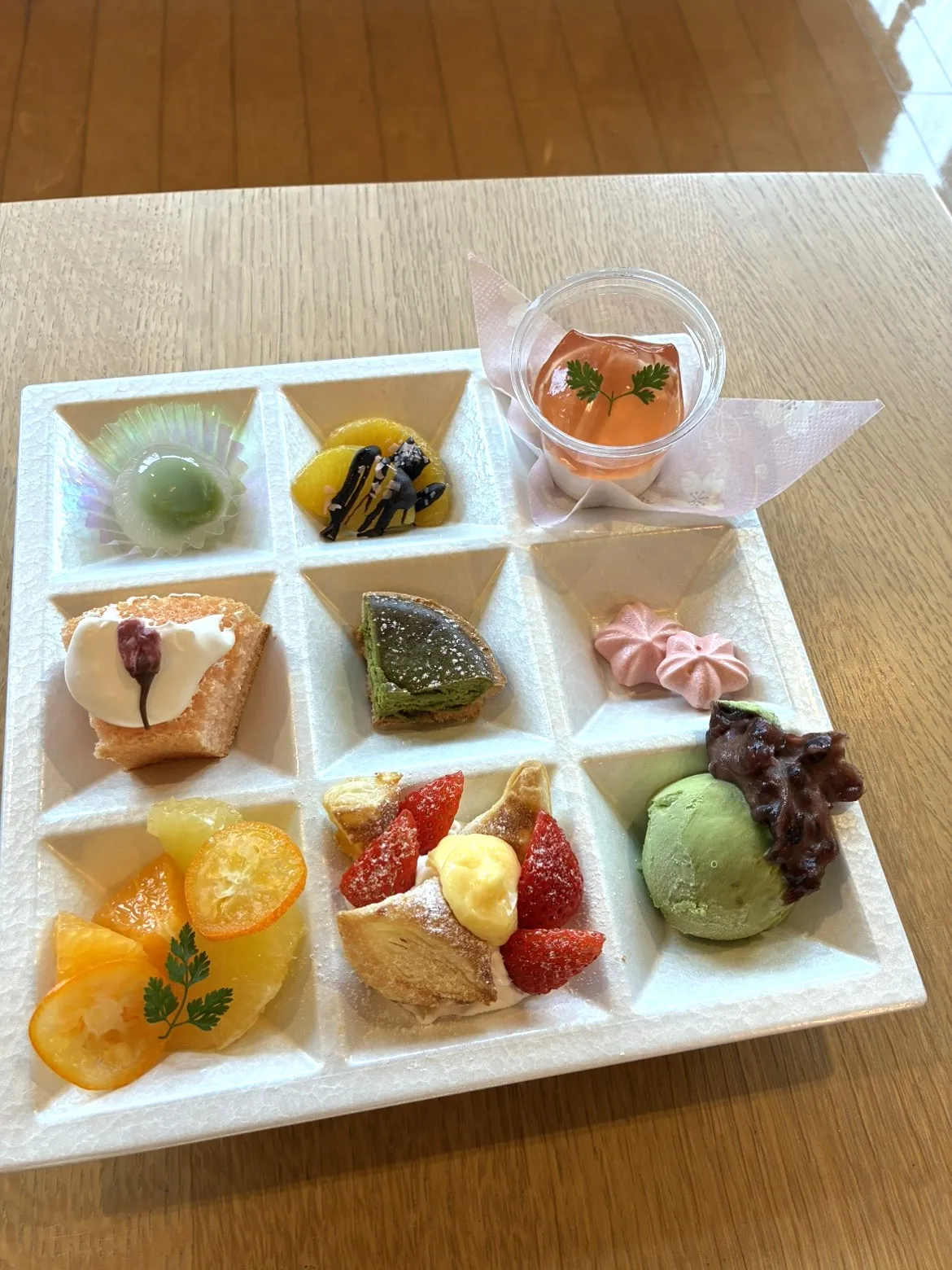 本日は、デザートプレートをご紹介します。イチゴ、抹茶、桜等春の食材を使ったデザート9種類をワンプレートに盛り付けました。丸いプレートは、柔らかめのお食事を召し上がっているお客様にご用意しました。調理スタッフ会心の1品です。