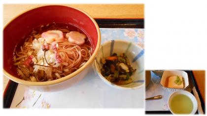お昼は「桜そば」です。桜色のそばの上に桜の飾り麩・桜の花の塩漬けを載せました。ほんのり桜の良い香りがします。