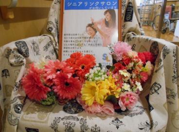 3月27日は毎月1回の「シニアリンク美容室」の開店日です。入り口を花で飾り、お客様をご案内します。