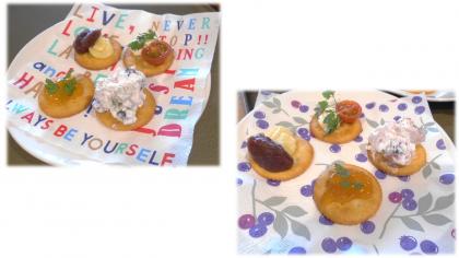 一口大のクラッカーに、4種類のトッピングを載せました。