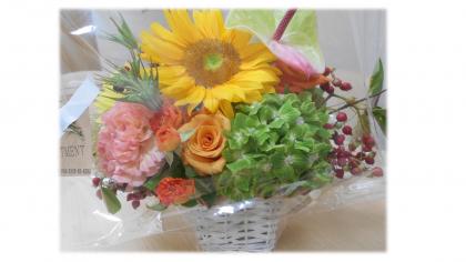 元気なヒマワリとオレンジのバラを中心にしたアレンジメントです。
