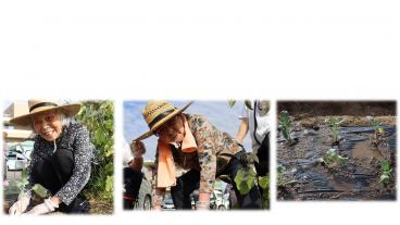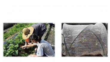 苗を植えたり、茄子を収穫したりと笑顔が絶えません。