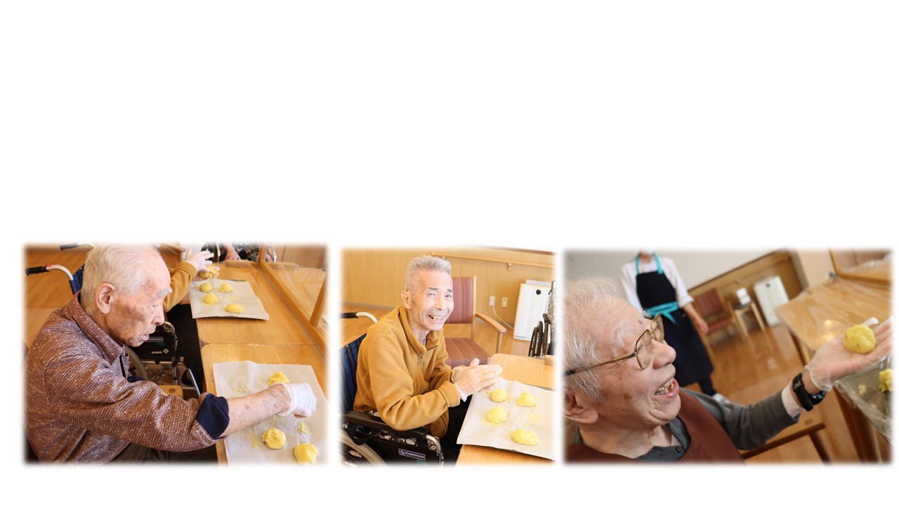 今月は調理職員も参加し、クッキングに挑戦です。「これは団子か?」「あんたのキレイだね~」と、皆様和気あいあいとした雰囲気でした。