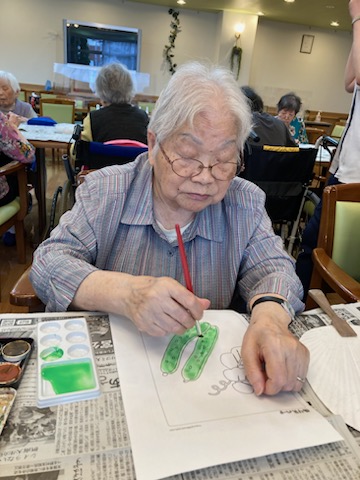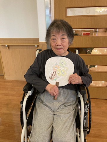 こんにちは看護主任の奥本です。全国的に梅雨に入りました。毎日ジメジメし気持ちもどんよりした気分になりますね。今回はジメジメを吹き飛ばして頂こうと、うちわ制作を行いました。お客様お一人おひとり、オリジナルうちわをご覧ください。暑さが吹き飛ぶ作品となりました。
