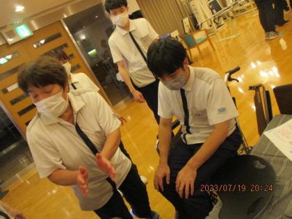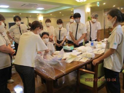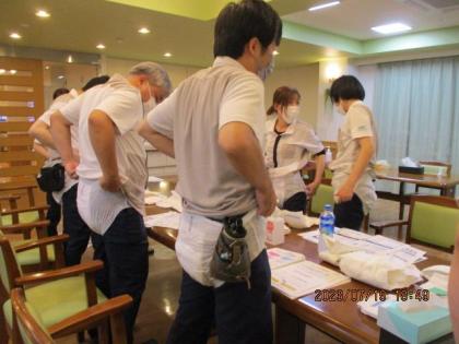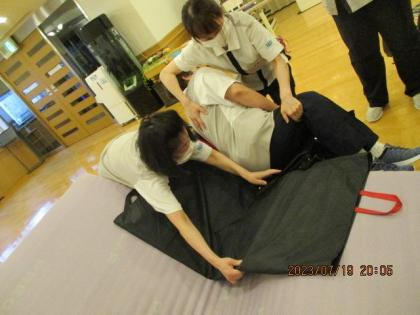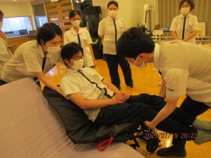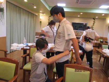 と冗談を交えながらも、介助されるお客様の気持ちになり、どのように介助を受けた時快適だったか、また介助する側は、されてるスタッフに感想を聞いたり、何度も入れ替わり体験しました。