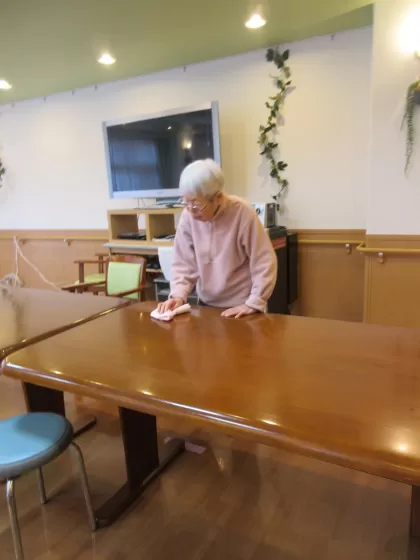 さて今回は、日頃の施設生活の中で、お客様には日常的な訓練の一つとして、色んなお手伝いをして頂いています。写真はその中の一つとして、食後のテーブル拭きをお願いし、頑張って頂いているところです。女性の皆様なら、自宅では普通に日常的にしていた動作ですが、施設に入居してやらなくなってしまった日常動作も多々あると思われます。そんな動作も施設の中では一つの訓練…。これからも皆さま頑張って、健康で長生きしてくださいね!!