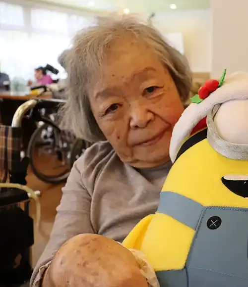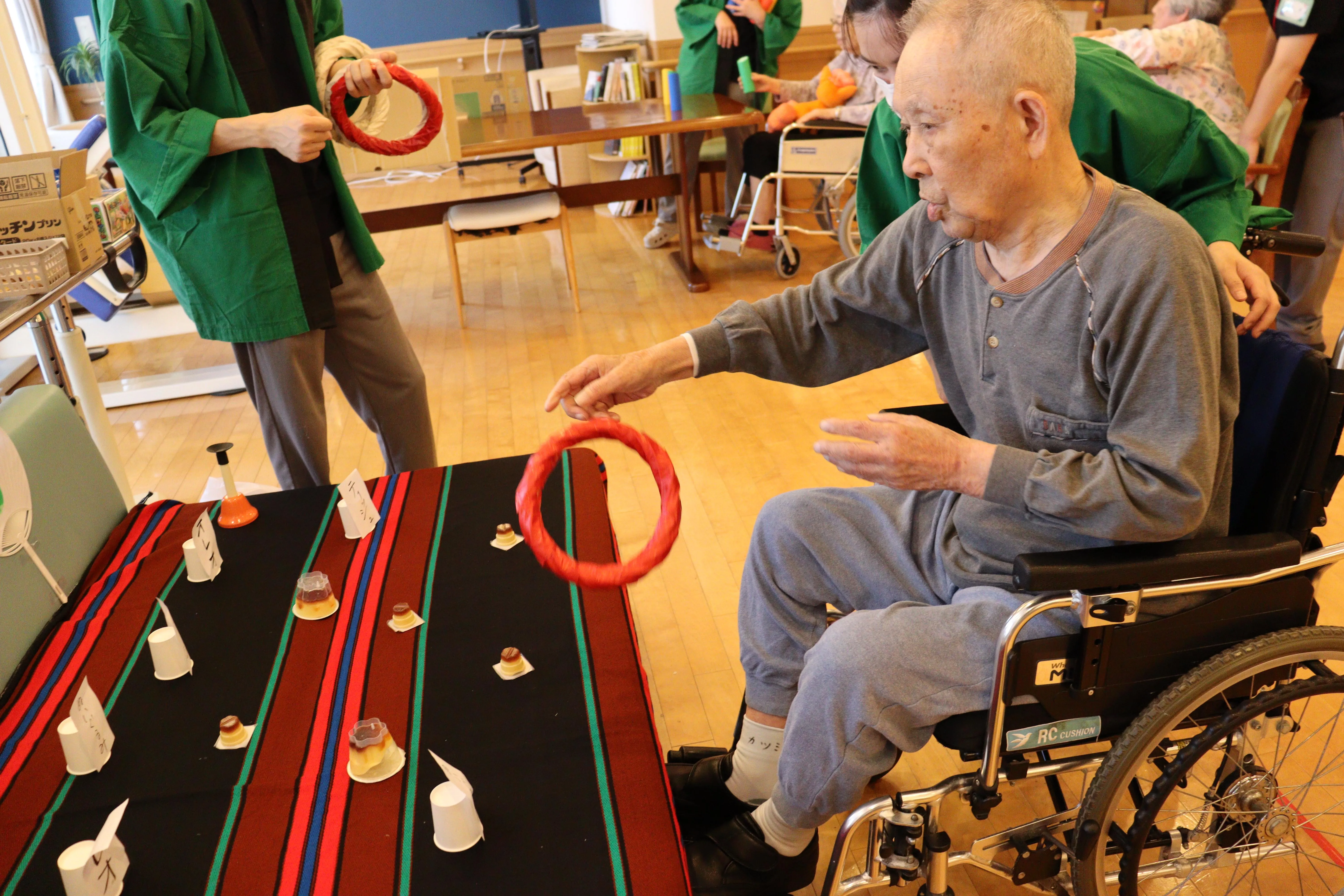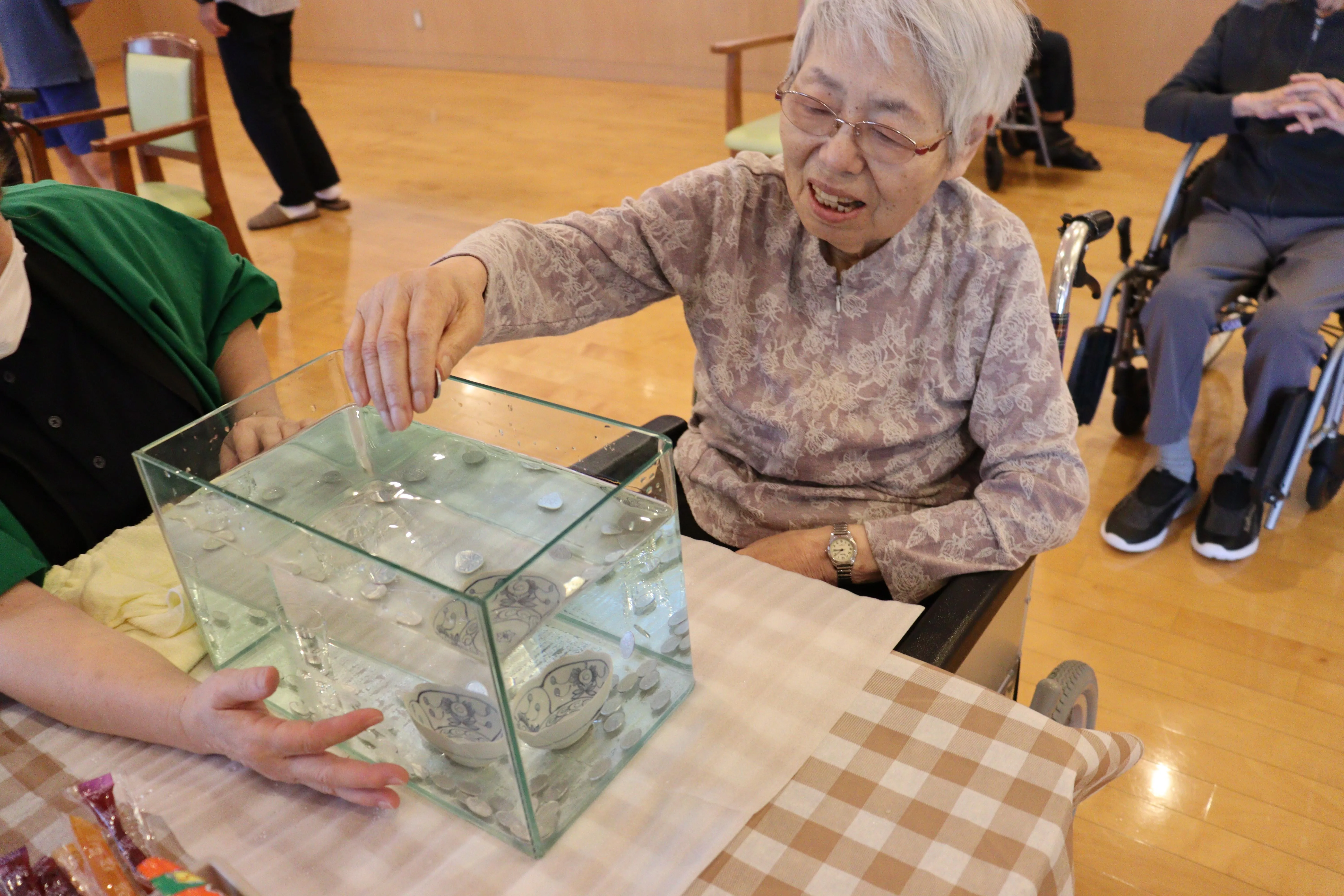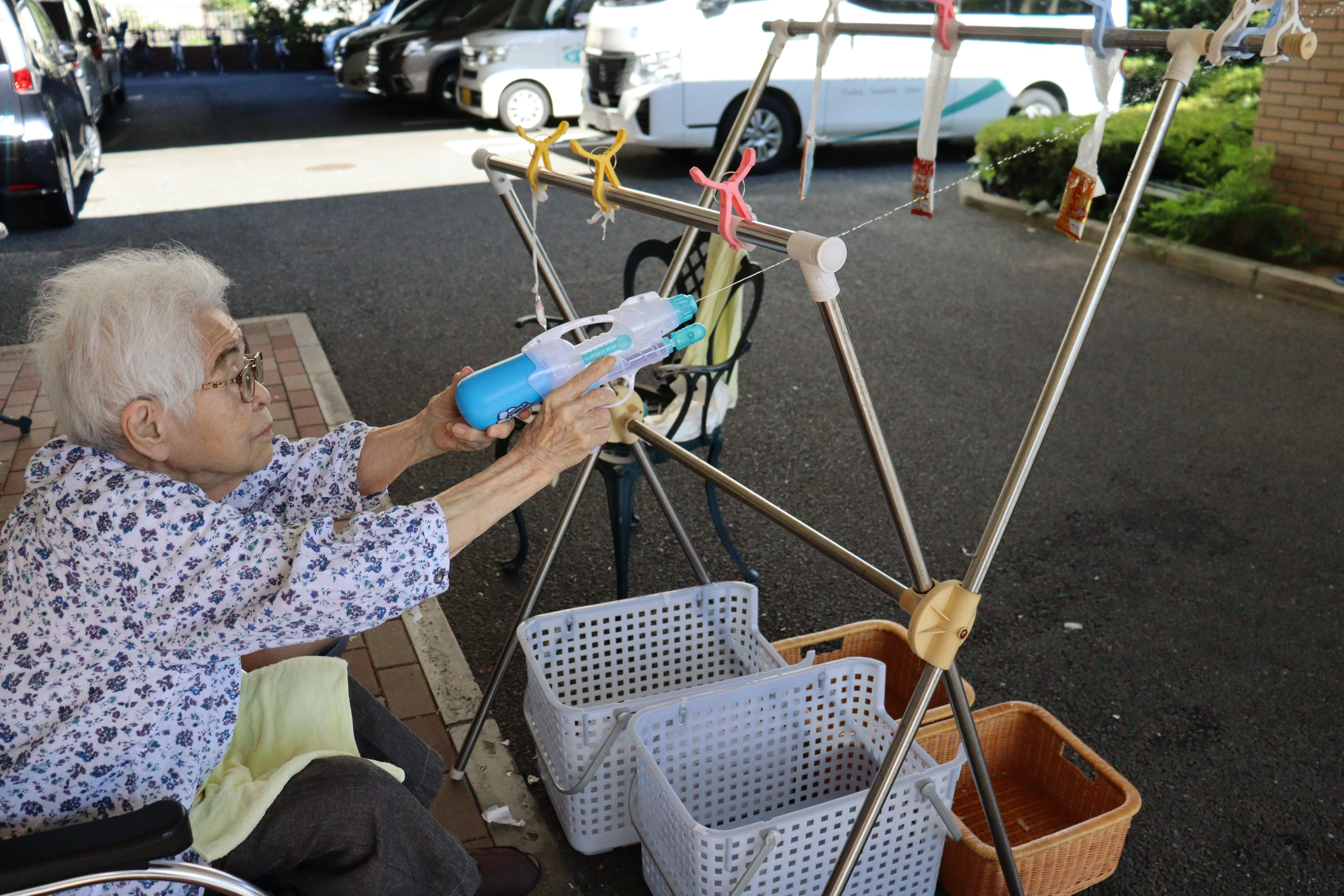 玄関前では水鉄砲射的を行いました。こちらでも「届かんな~」「これぐらいでしな取られへん」と定位置より前でされていました。射的の景品はお菓子でしたが、お好きなお菓子をめがけてされていました。その表情はまさに真剣。皆さま全部落とされていました。