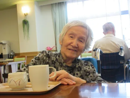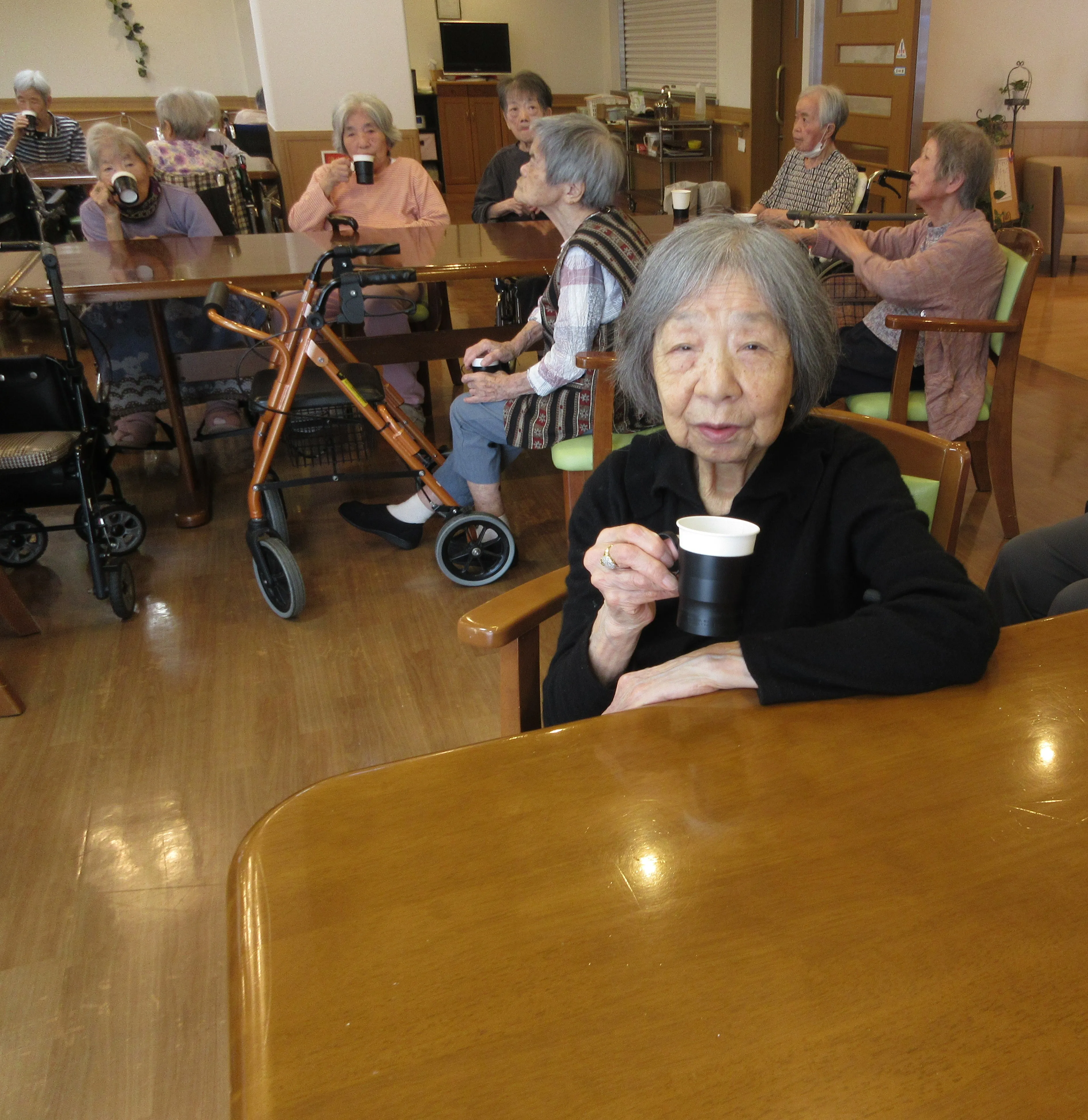 食事の後で、周りの方と雑談しながらのコーヒーや柚子茶、午前のルーティンである『朝の体操』の後のコーヒータイム、『おとなの学校』に参加し教科書を開きながら片手間に飲むコーヒー、気分転換に食堂に設置してある給茶機にてお好きな飲み物を飲んで頂いたり、さまざまな工夫を凝らしておすすめしています。