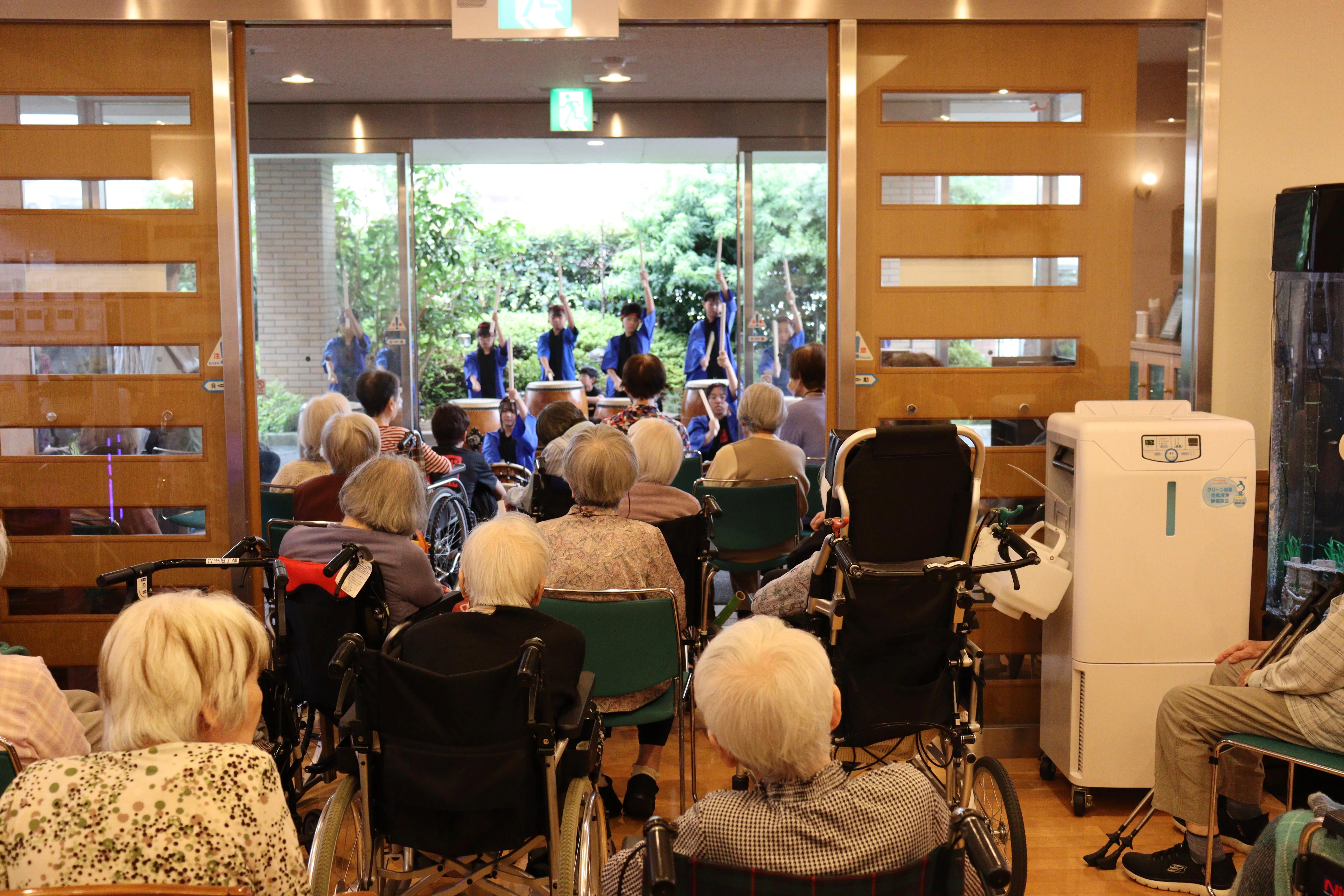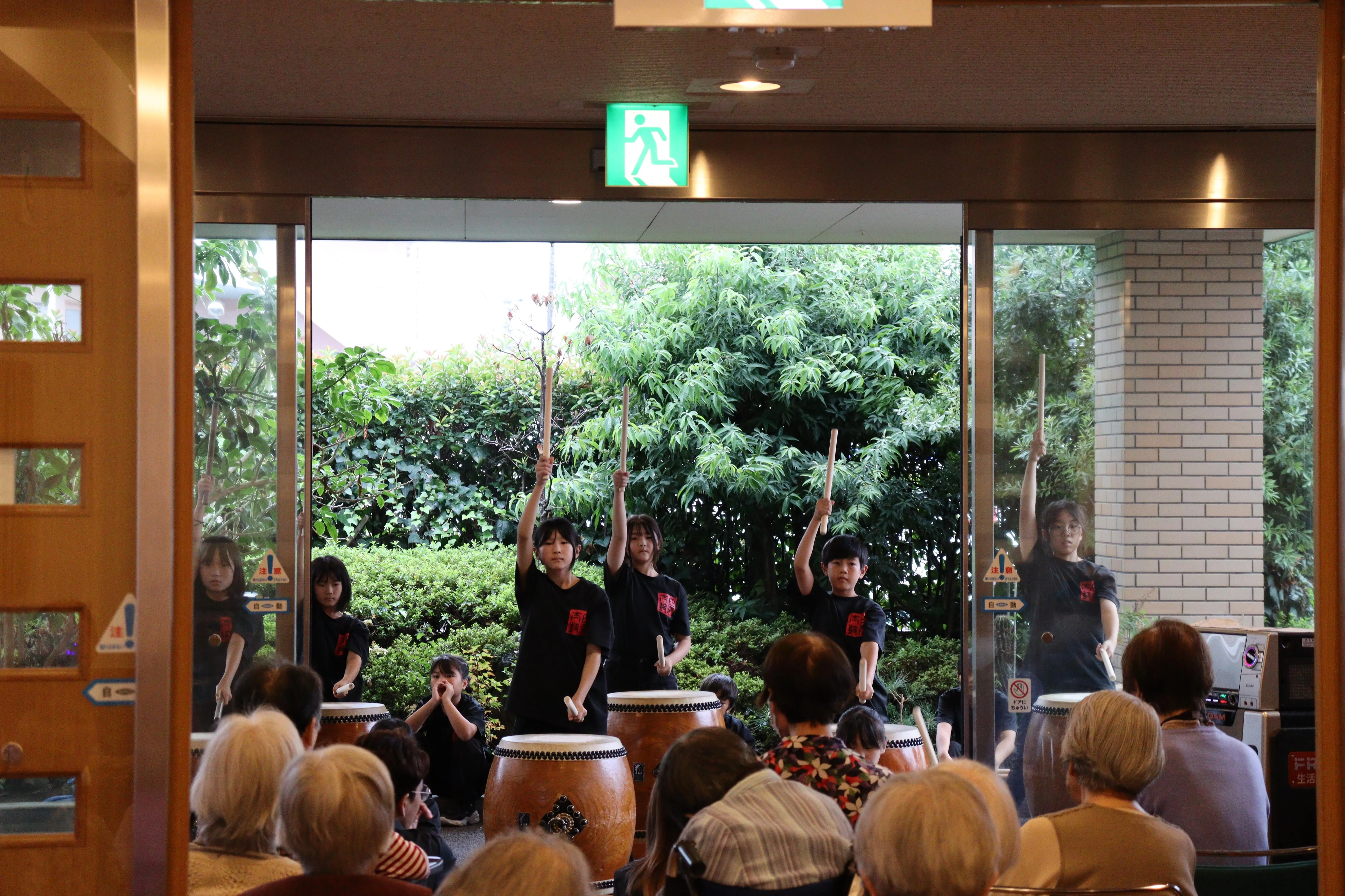 皆さま、こんにちは!今回は地域の小・中学校の子どもたちで構成されている四条太鼓さんが来て、太鼓の演奏会をしてくださいました。この日は天候も思わしくなく演奏会も危ぶまれておりましたが、開催できました。