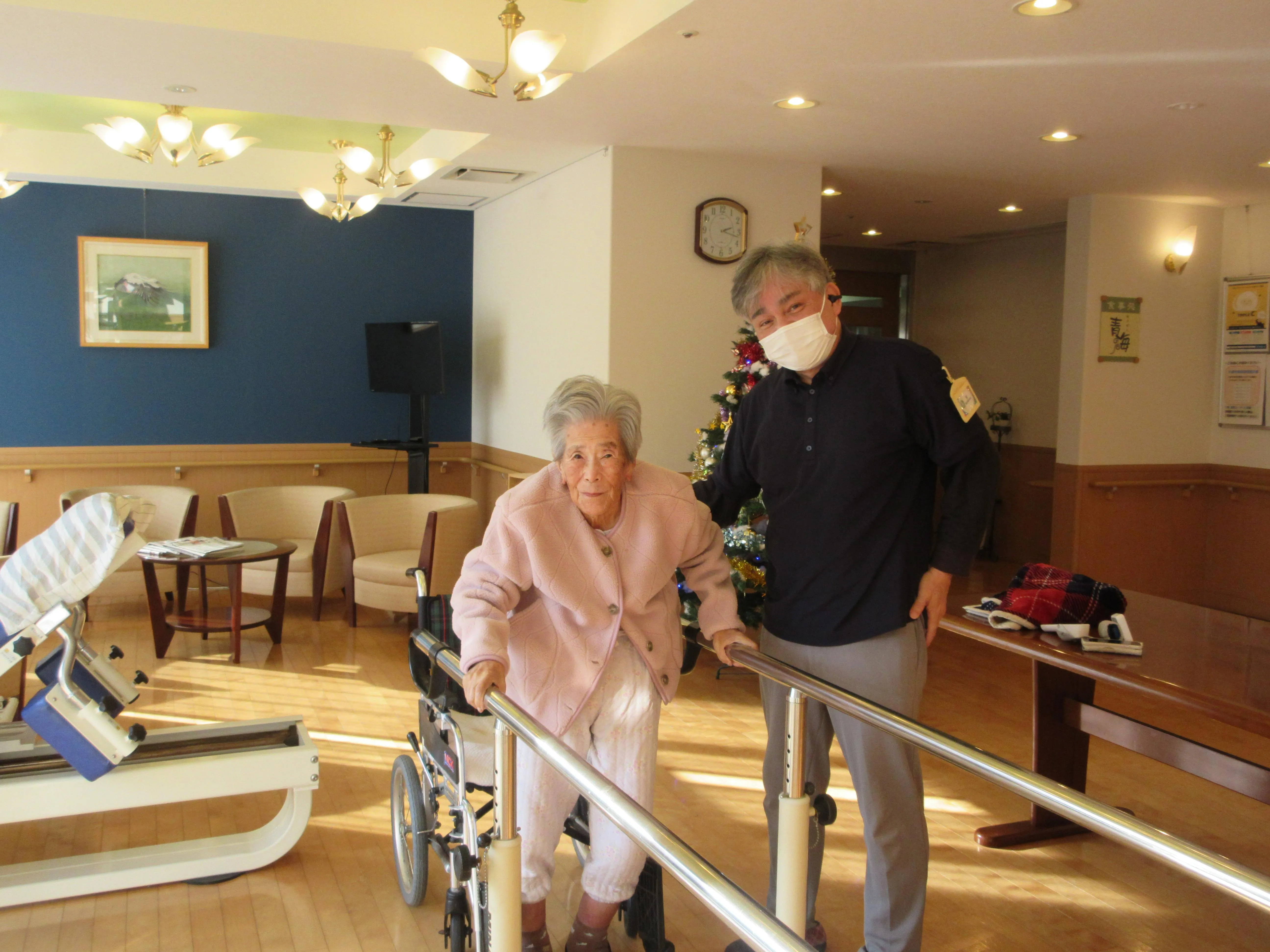 写真はつい先日に100歳を迎えられたお客様との、訓練中の写真です。施設ニュース『機能訓練風景』にも今月のニュースとしてアップさせて頂いておりますが、私の個人的な目標として、100歳になっても自分の足で立って頂く、また平行棒内で自分の足で歩いて頂く、この目標を達成できた事が本当に嬉しく、また頑張っていこうと思います。