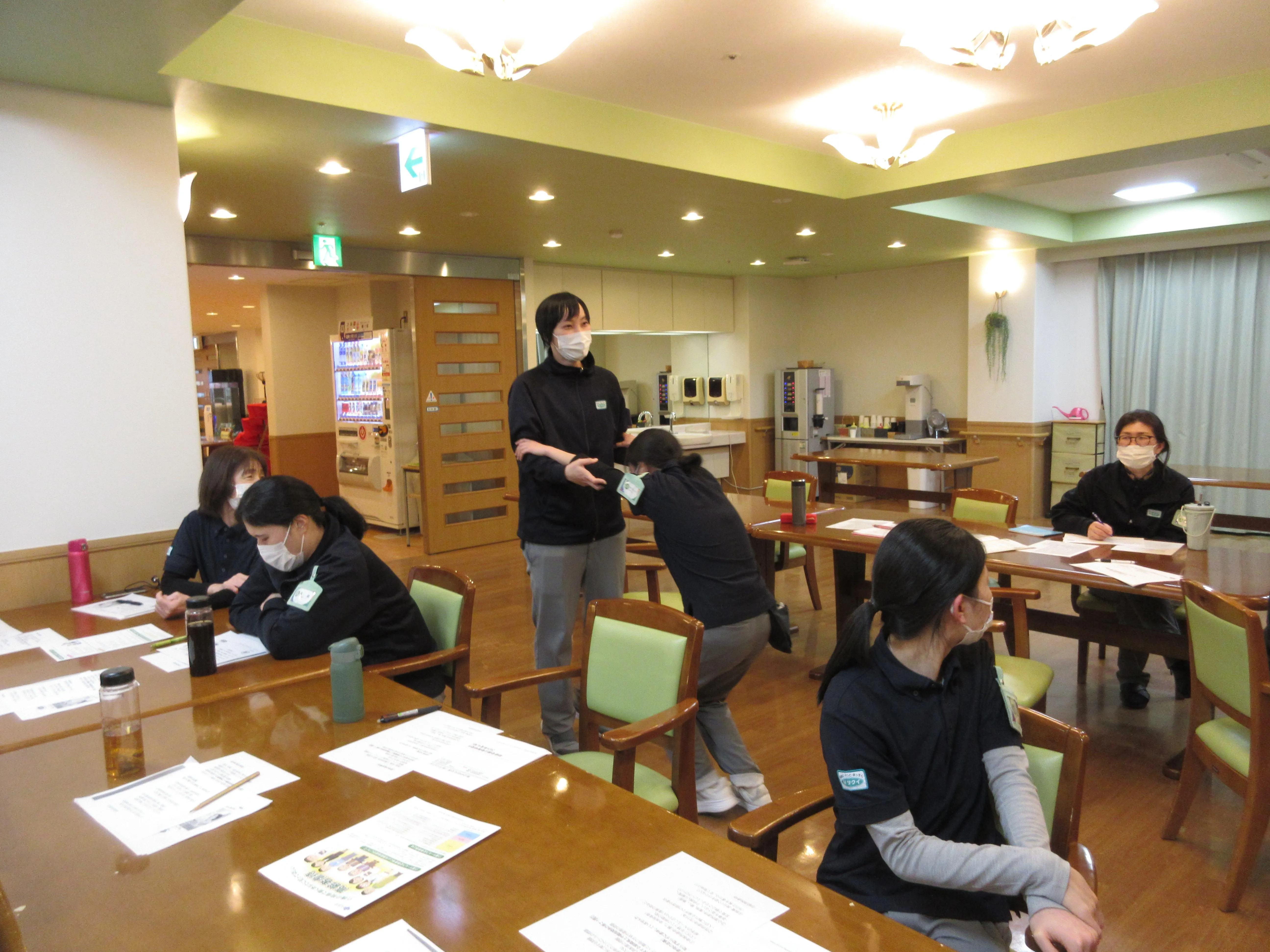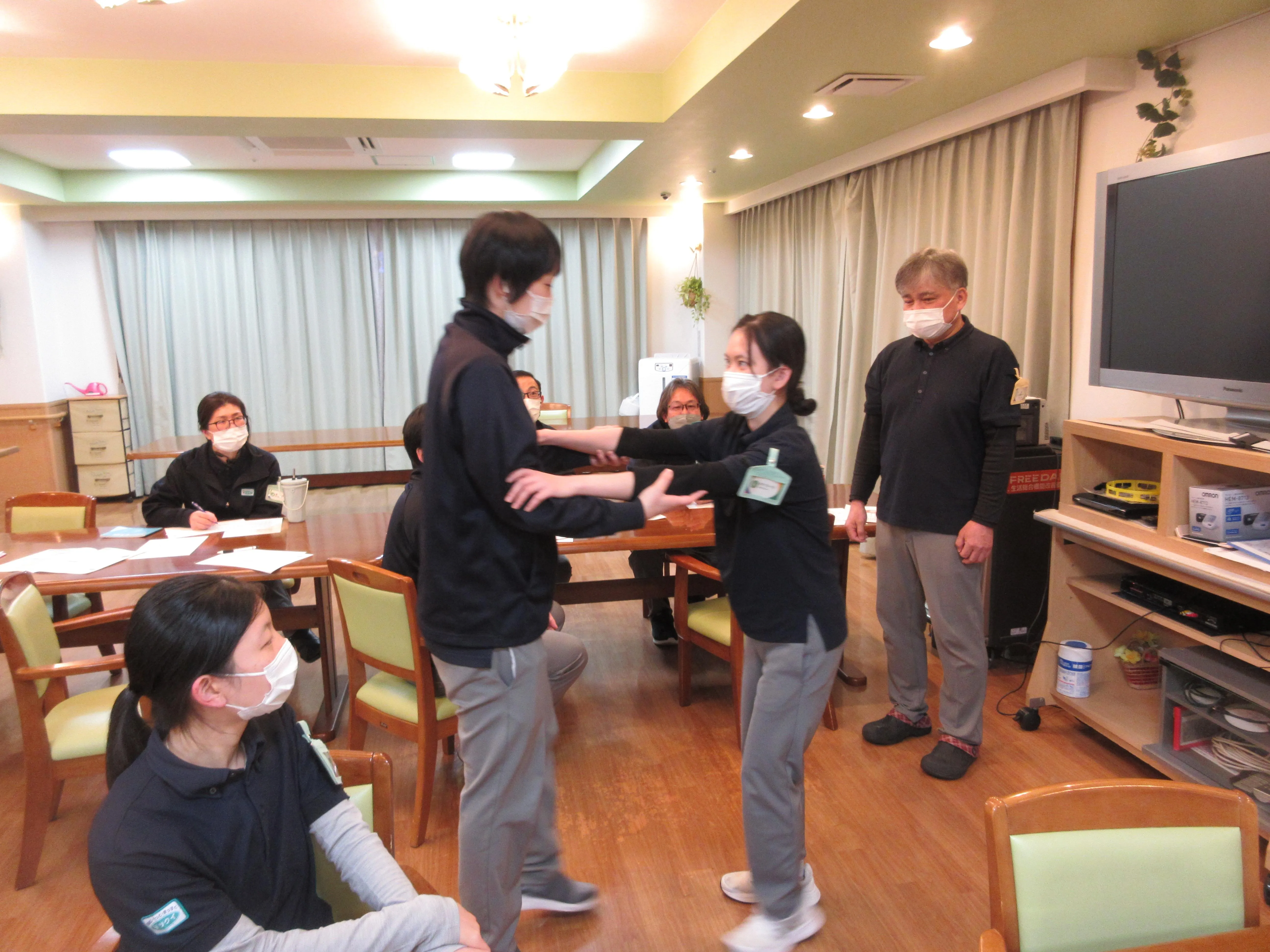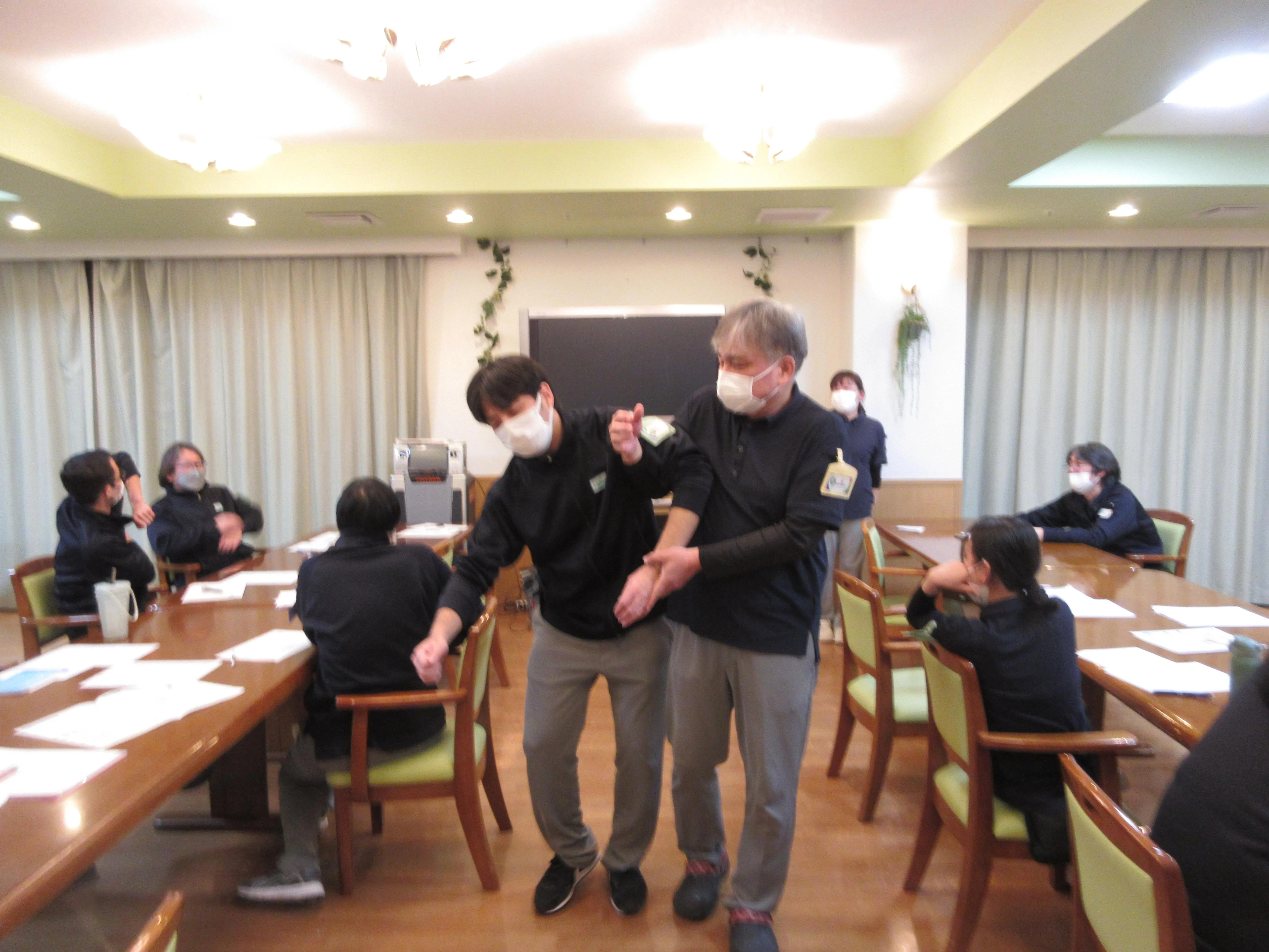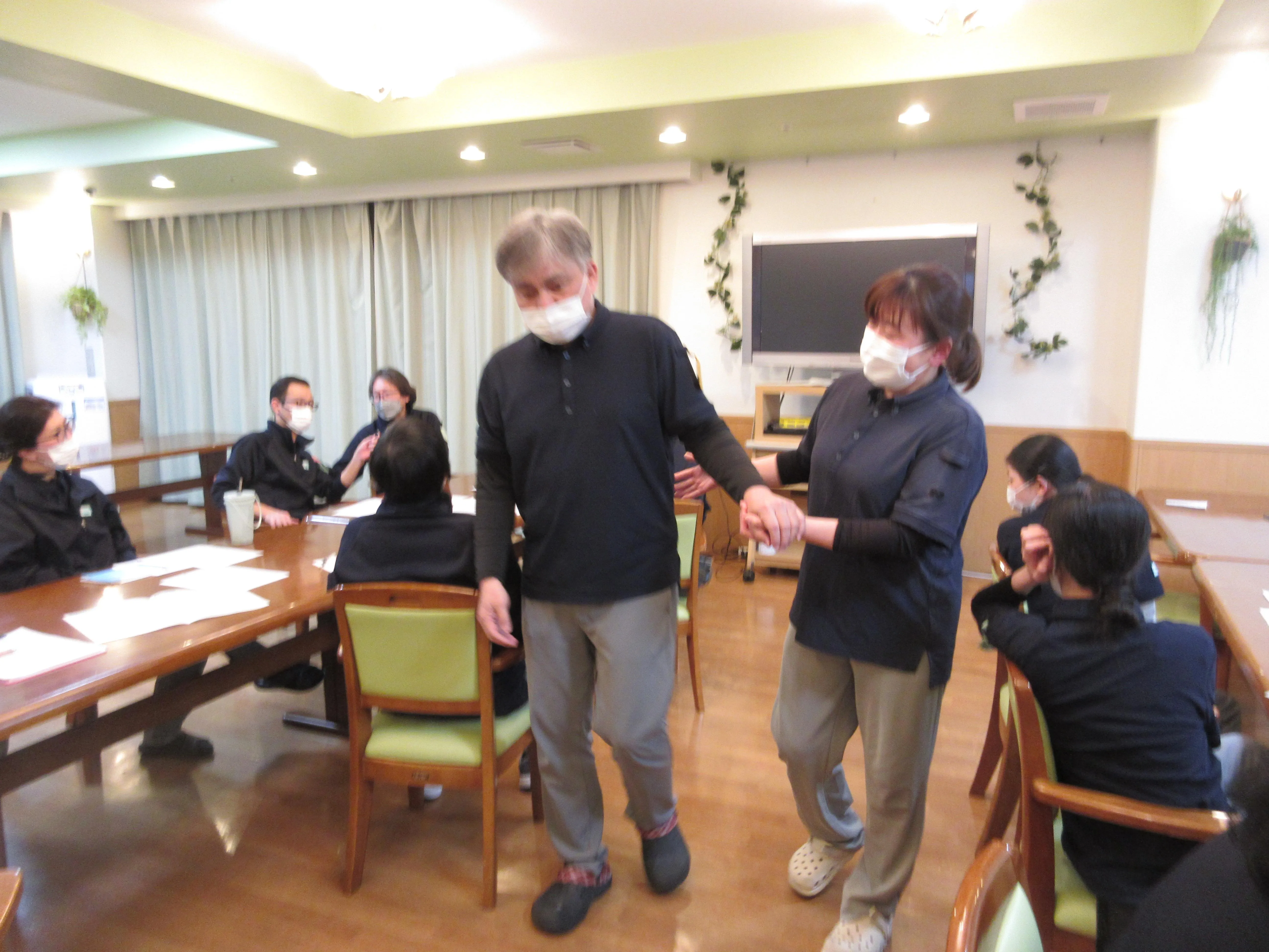 毎月、その時に気になる内容についての講座を開いているのですが、今回は歩行に軽い介助が必要なお客様を想定して、どの様な介助が良いのか?又は悪いのか?など、実際にスタッフさんにも介助する側、される側の体験をしてほしいと思い開催しました。