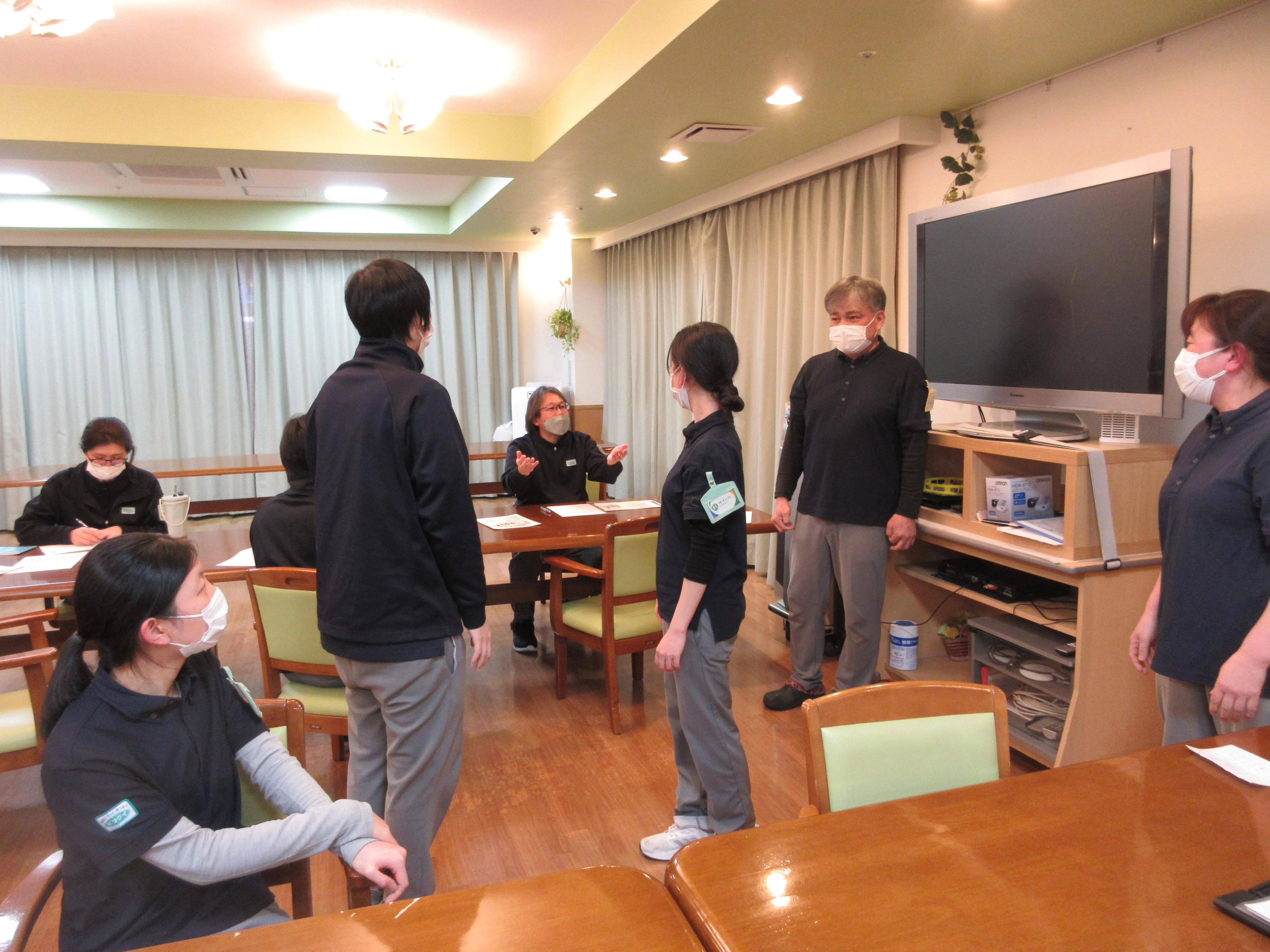 今回ご紹介させて頂く風景は、月に一度、こちらツクイ・サンシャイン大東で開催おります、各部署参加の全体会議の中で行わせている『機能訓練ミニ講座』の模様です。