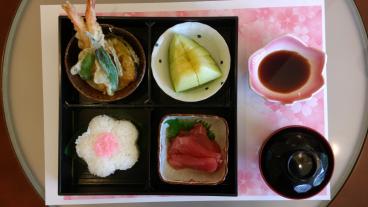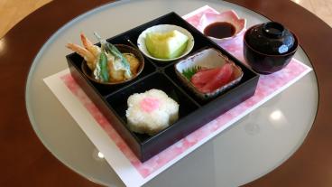 押し型ごはんに桜でんぷん。。お花見弁当風にして、天ぷらも楽しんでいただきます。