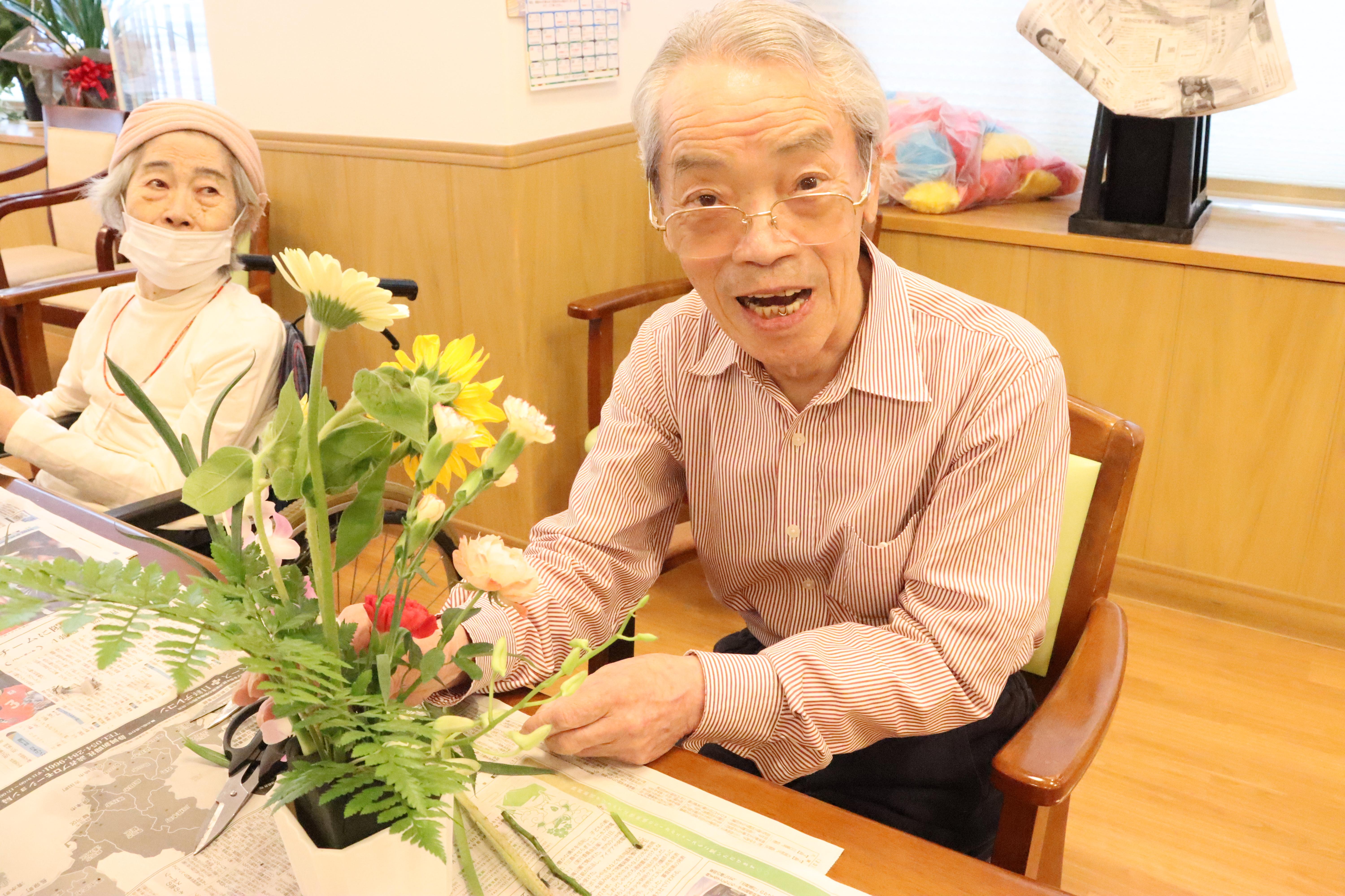 定期開催のフラワーアレンジメント教室です。講師の先生を招き開催しています。今回は16名の方が参加いたしました。お客様の皆さま上手にアレンジされていました。完成したフラワーアレンジメントは居室にて皆さま飾られています。