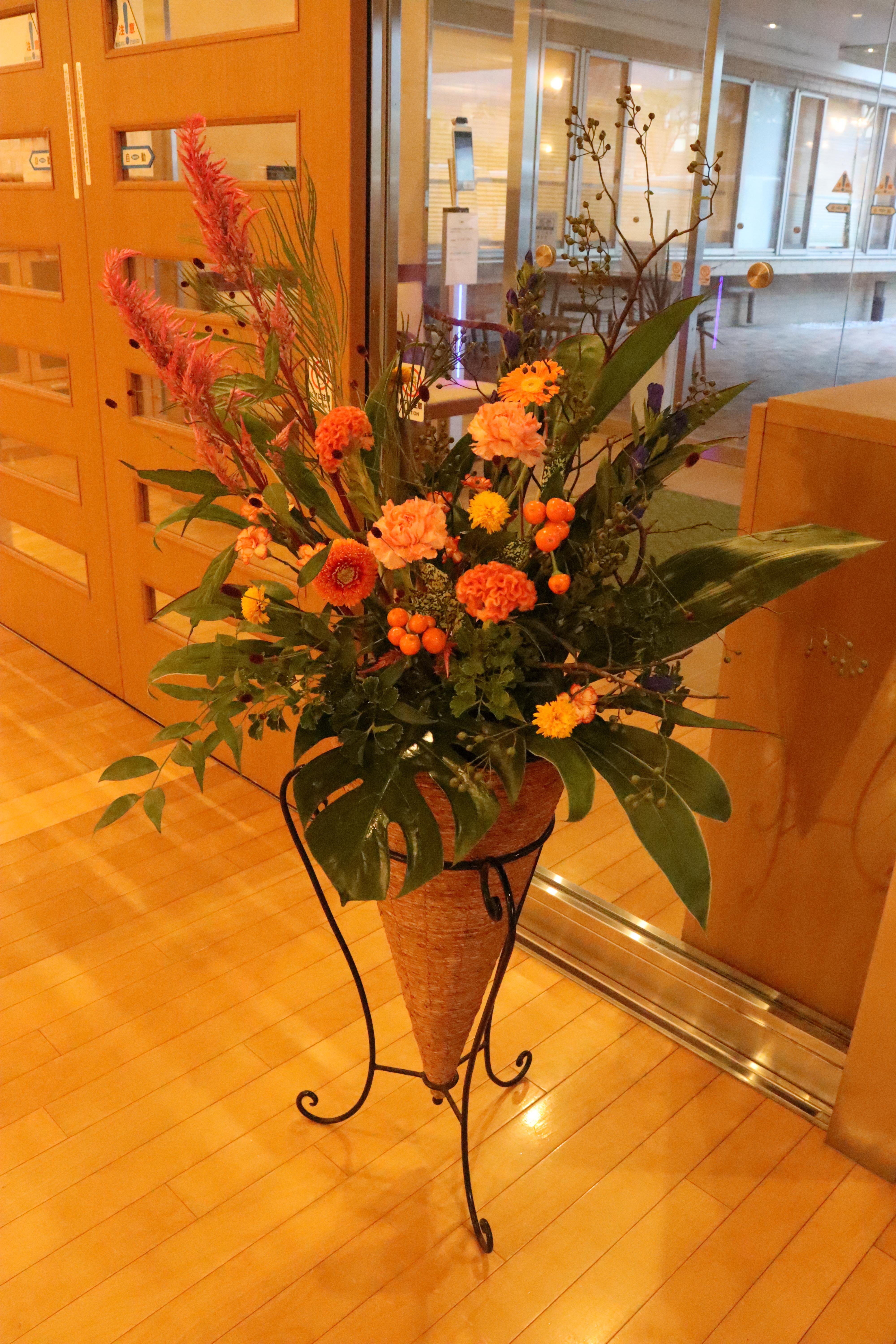 本日フラワーアレンジメント教室を開催いたしました。参加者は9名と少なかったですが、お客様は講師の先生に聞きながらフラワーアレンジを作られていました。作品が完成しお客様さまと一緒に写真撮影を行いました。