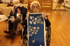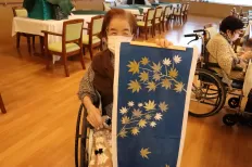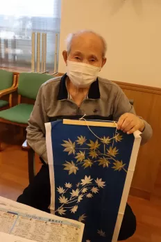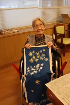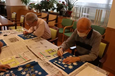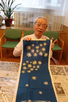 紅葉の手ぬぐいにの絵に、布用のペンで色を付けます。