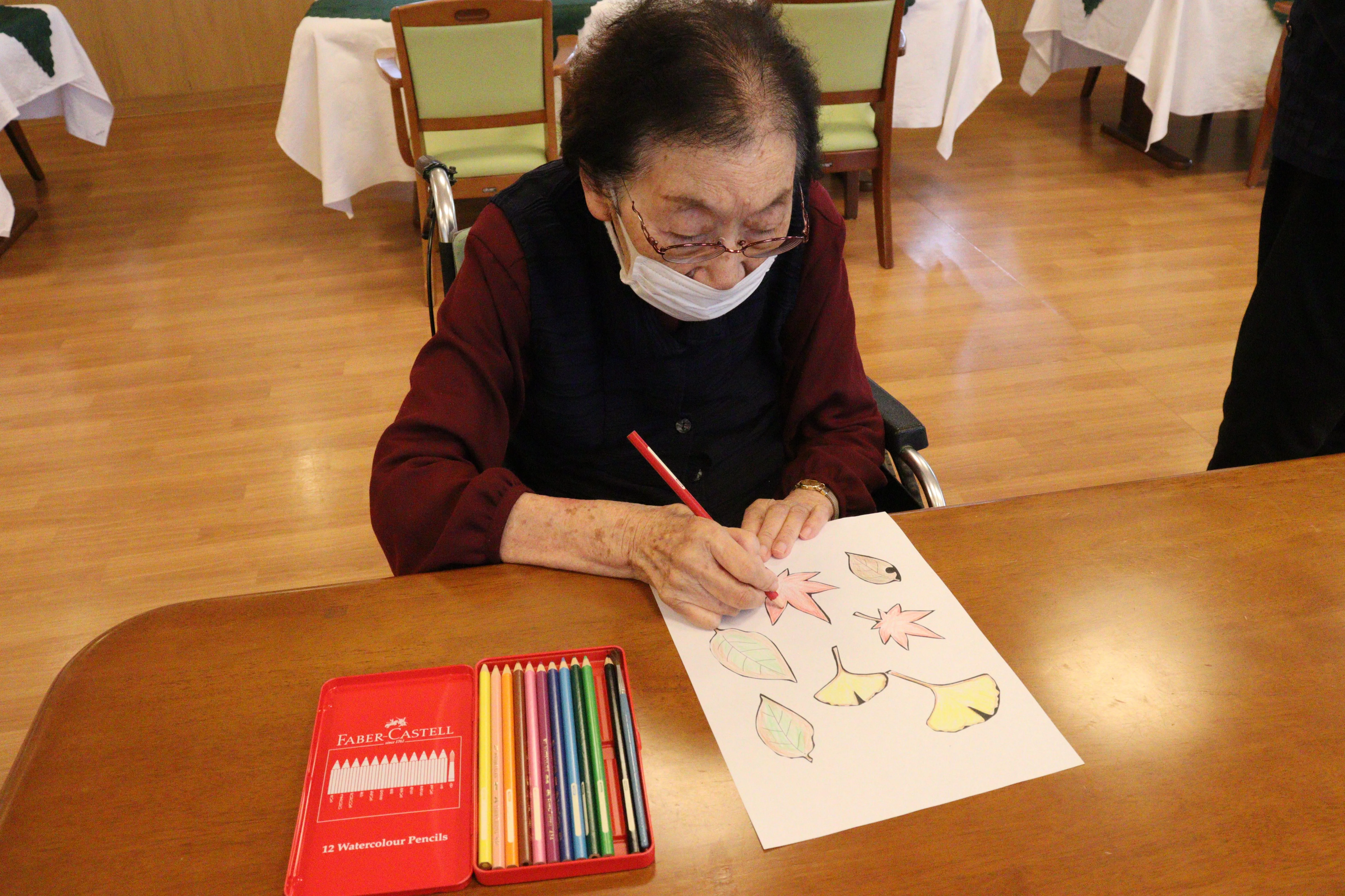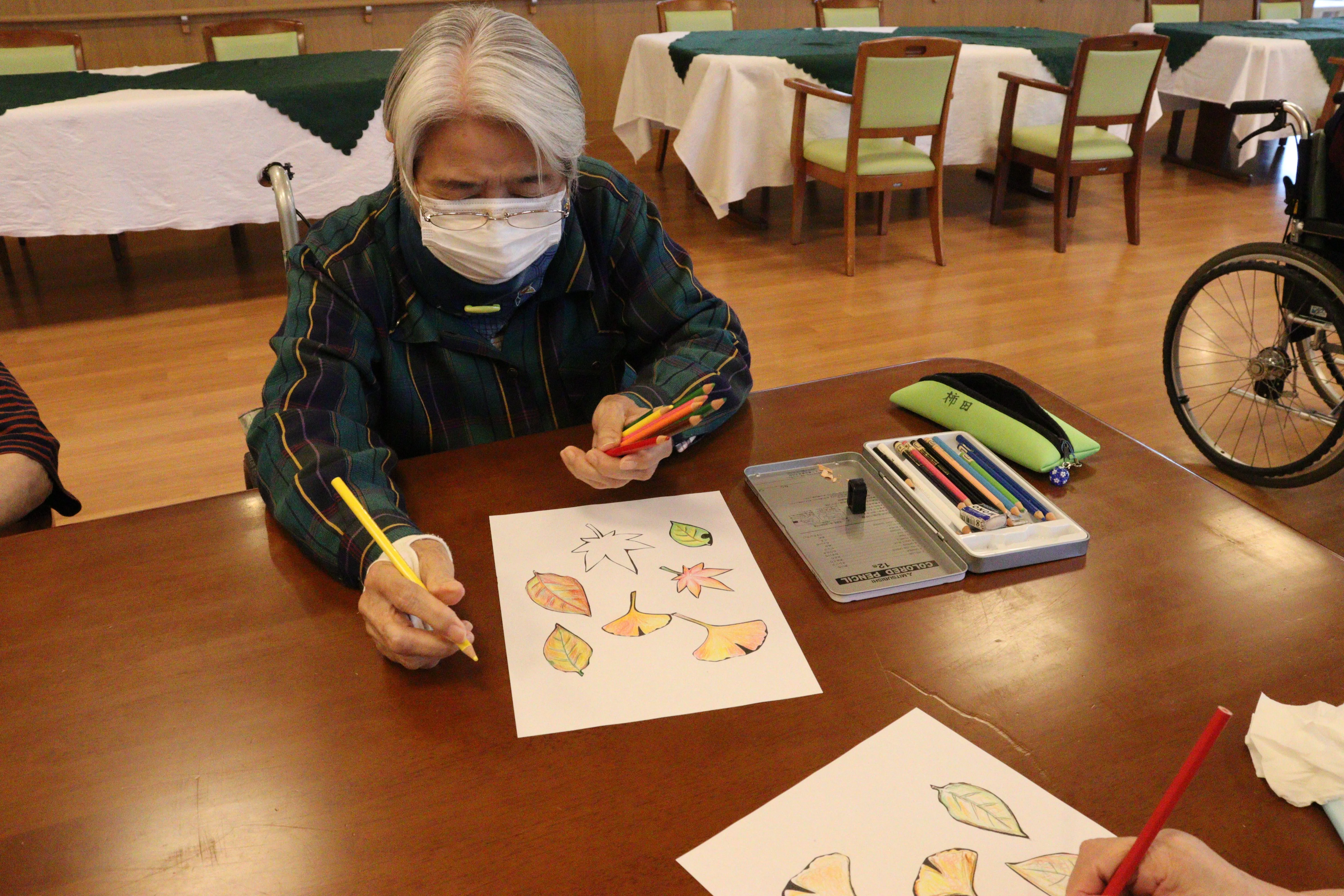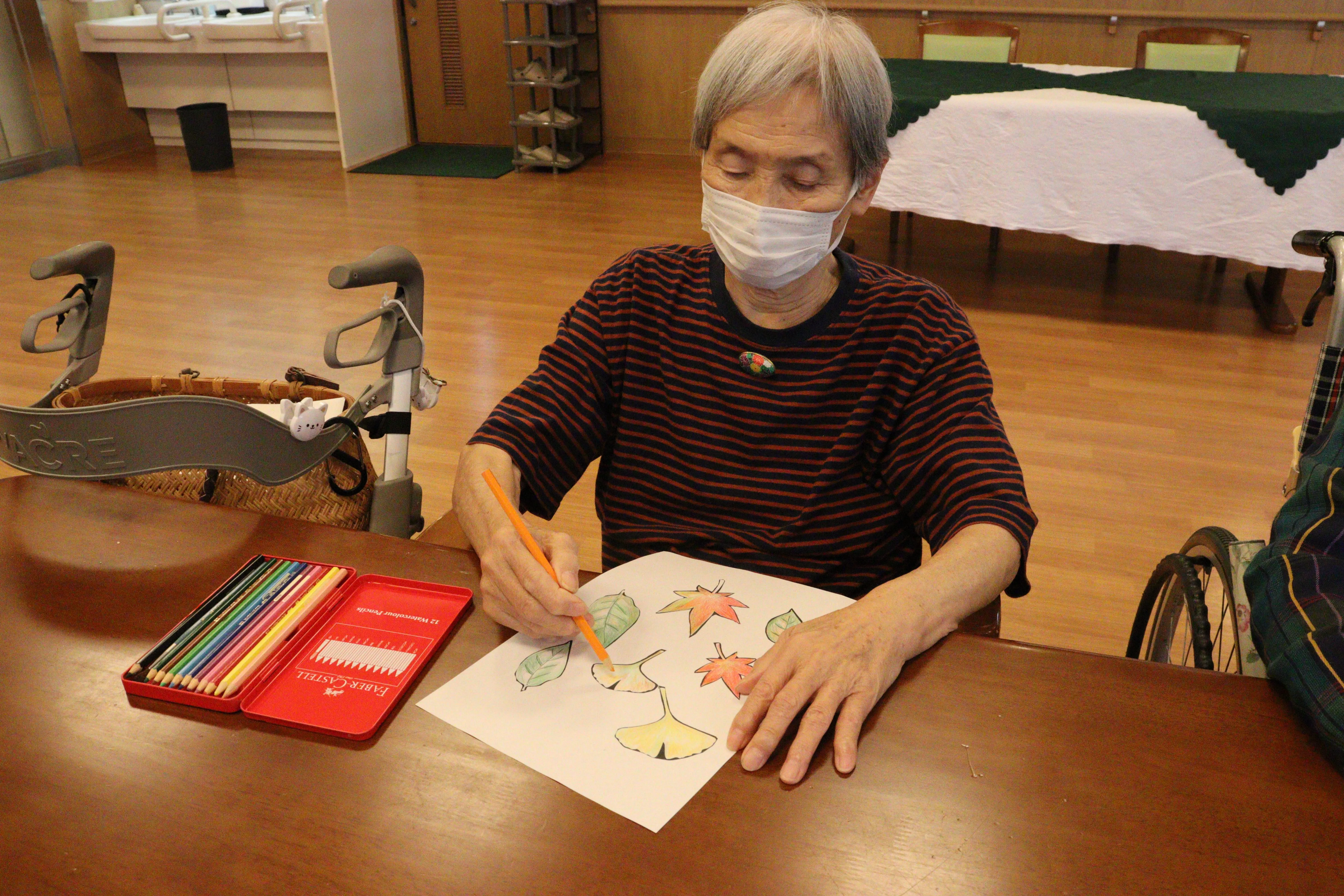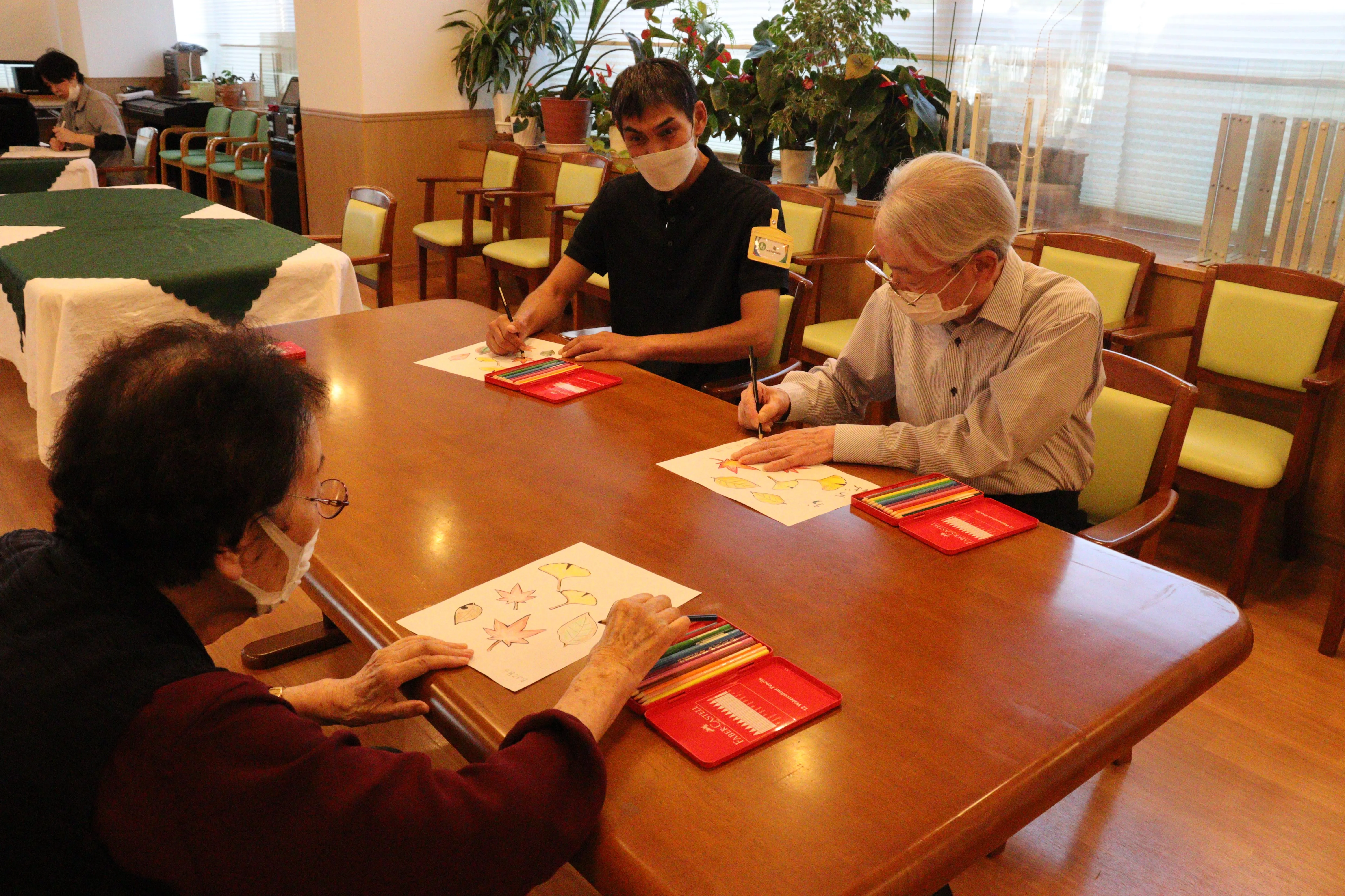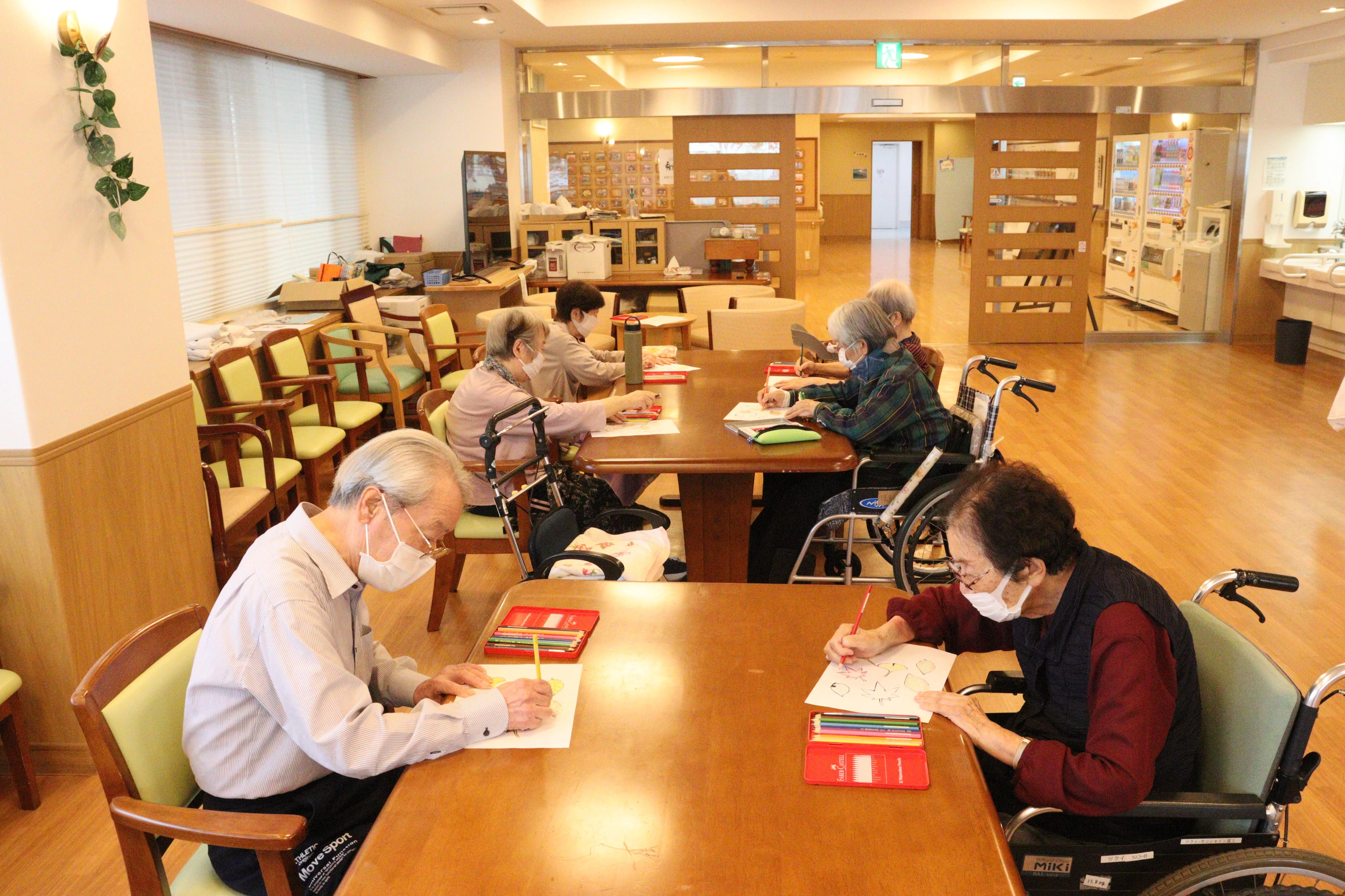 定期的に開催しているお絵かき教室です。お客様、自由に好きな色で塗り絵を行って頂きます。目と手の協調動作の練習や集中力の維持にもつながります。楽しみながら機能訓練の一環として、今後も提供していきたいと思います。