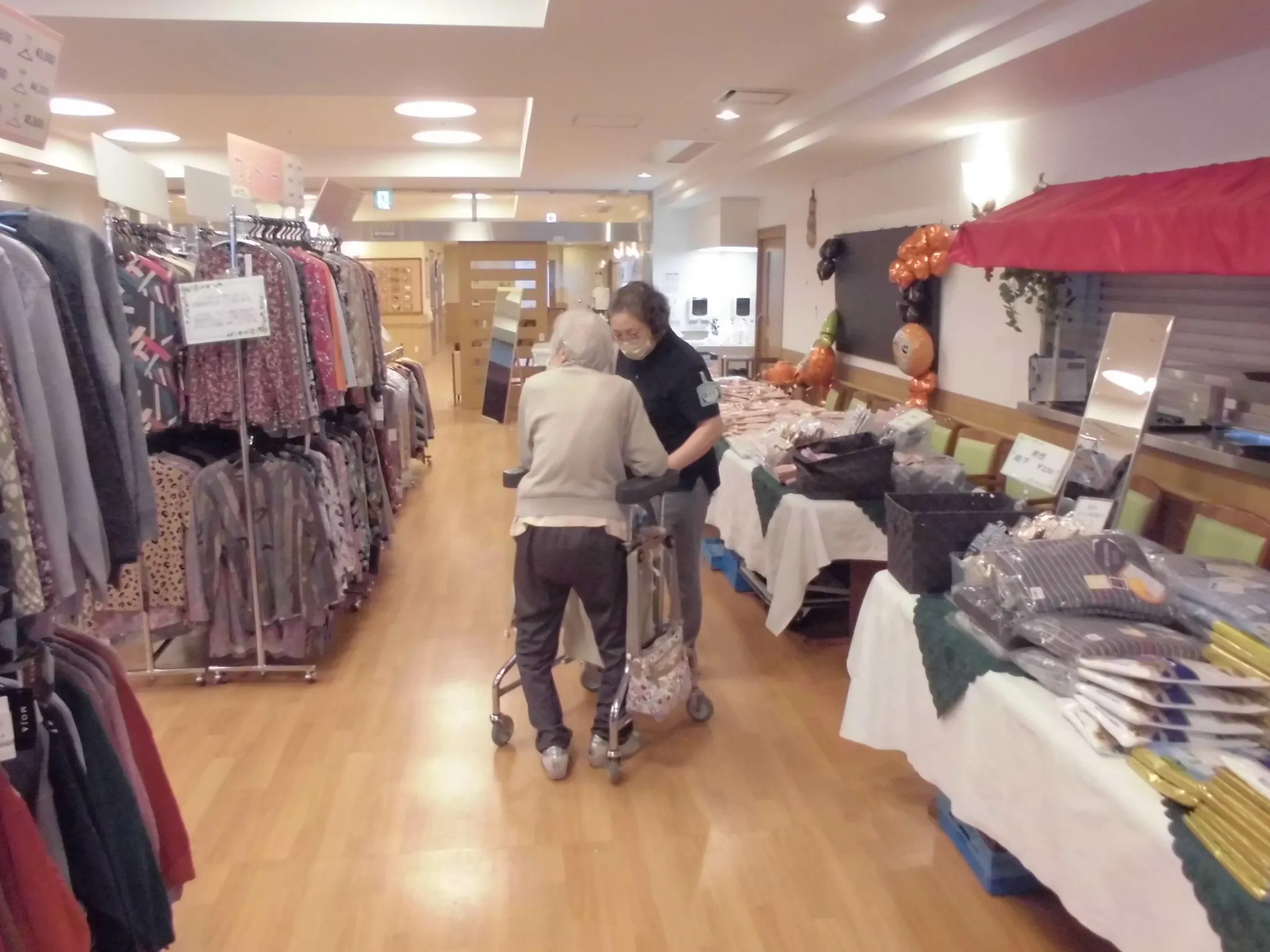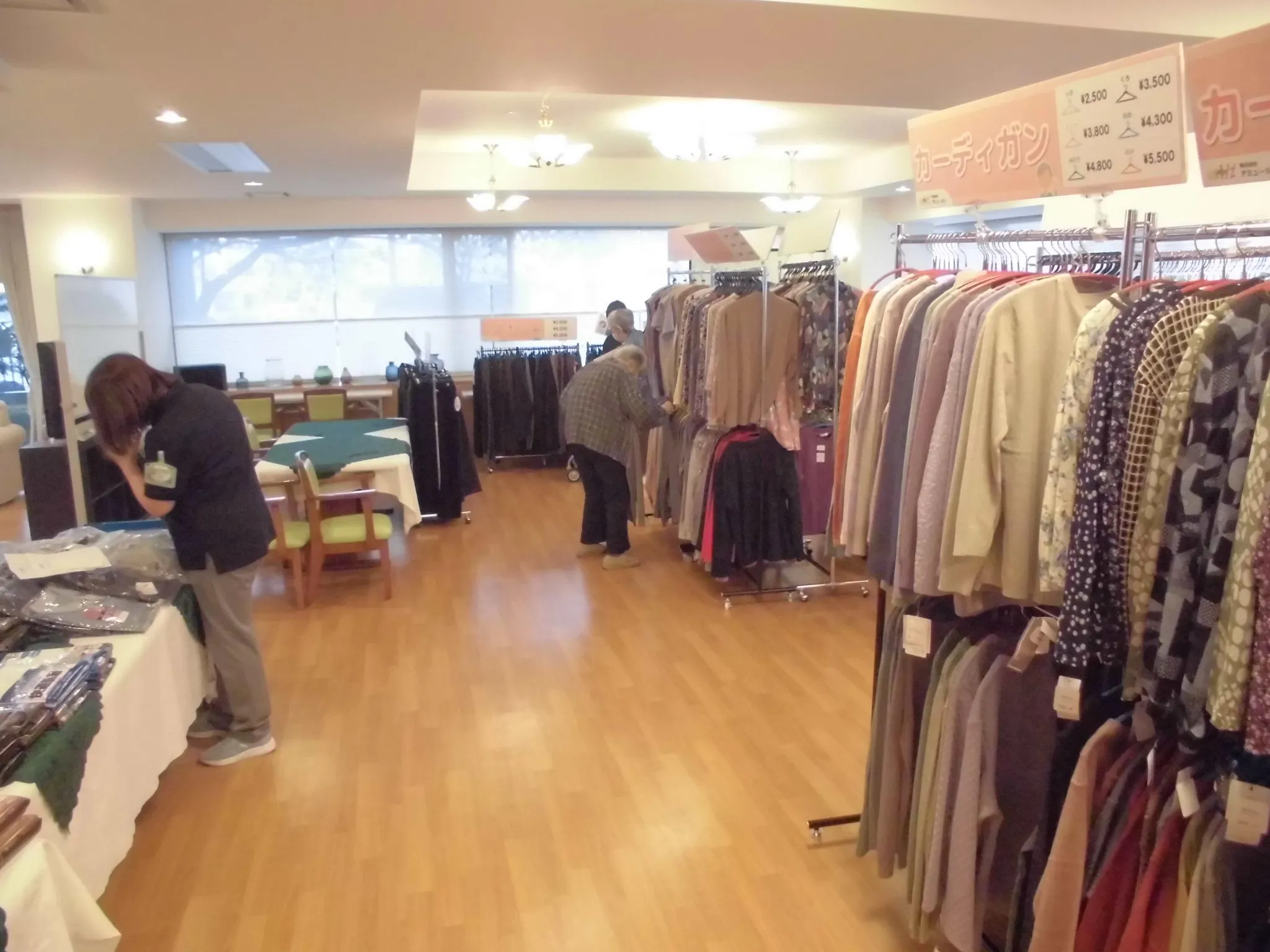 10月11日、ファッションフェアを開催いたしました。会場となった1階リビングにはこの日、様々な種類の衣服、さらには食品も陳列されました。多くのお客様が会場を訪れ、お買物を楽しまれていました。