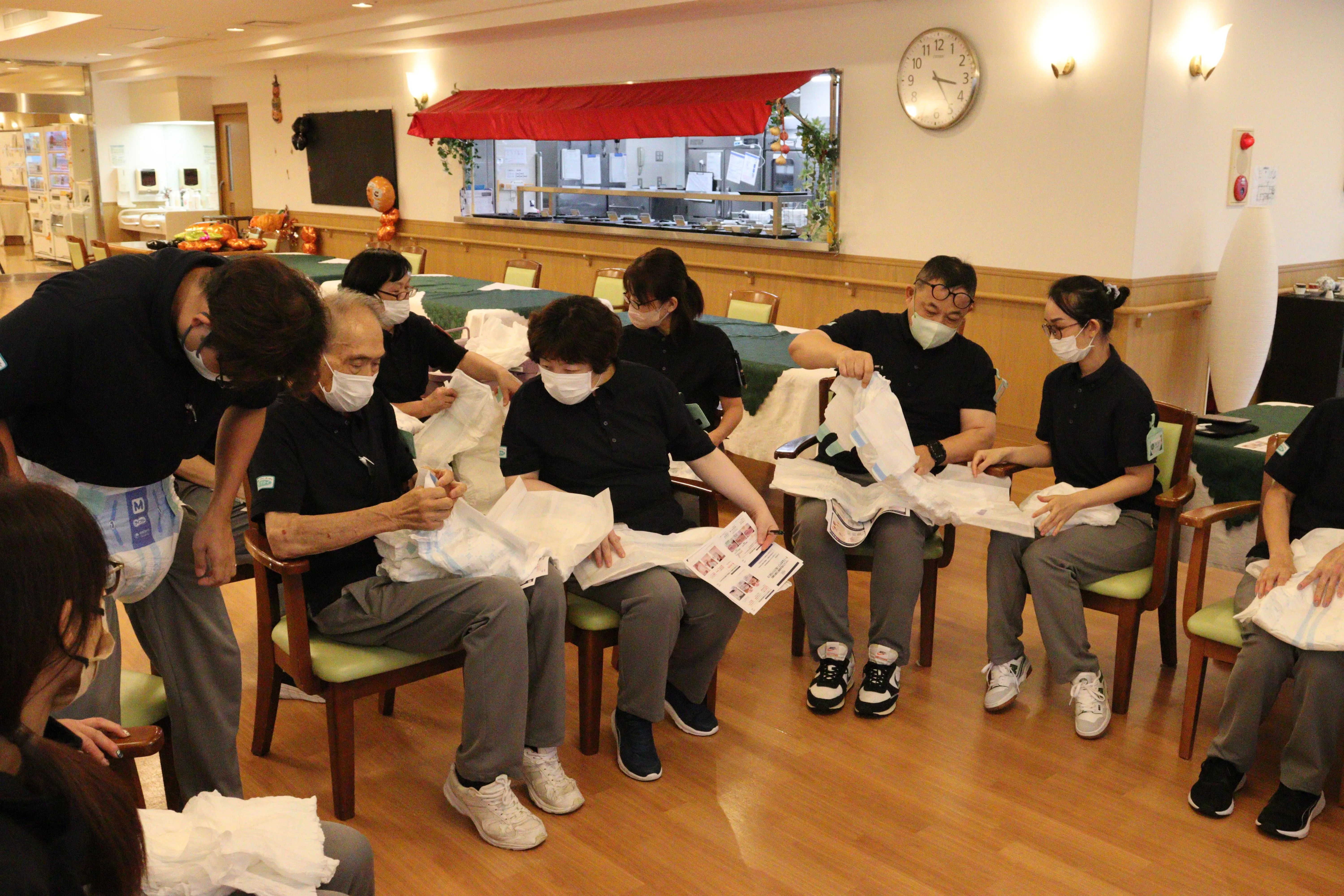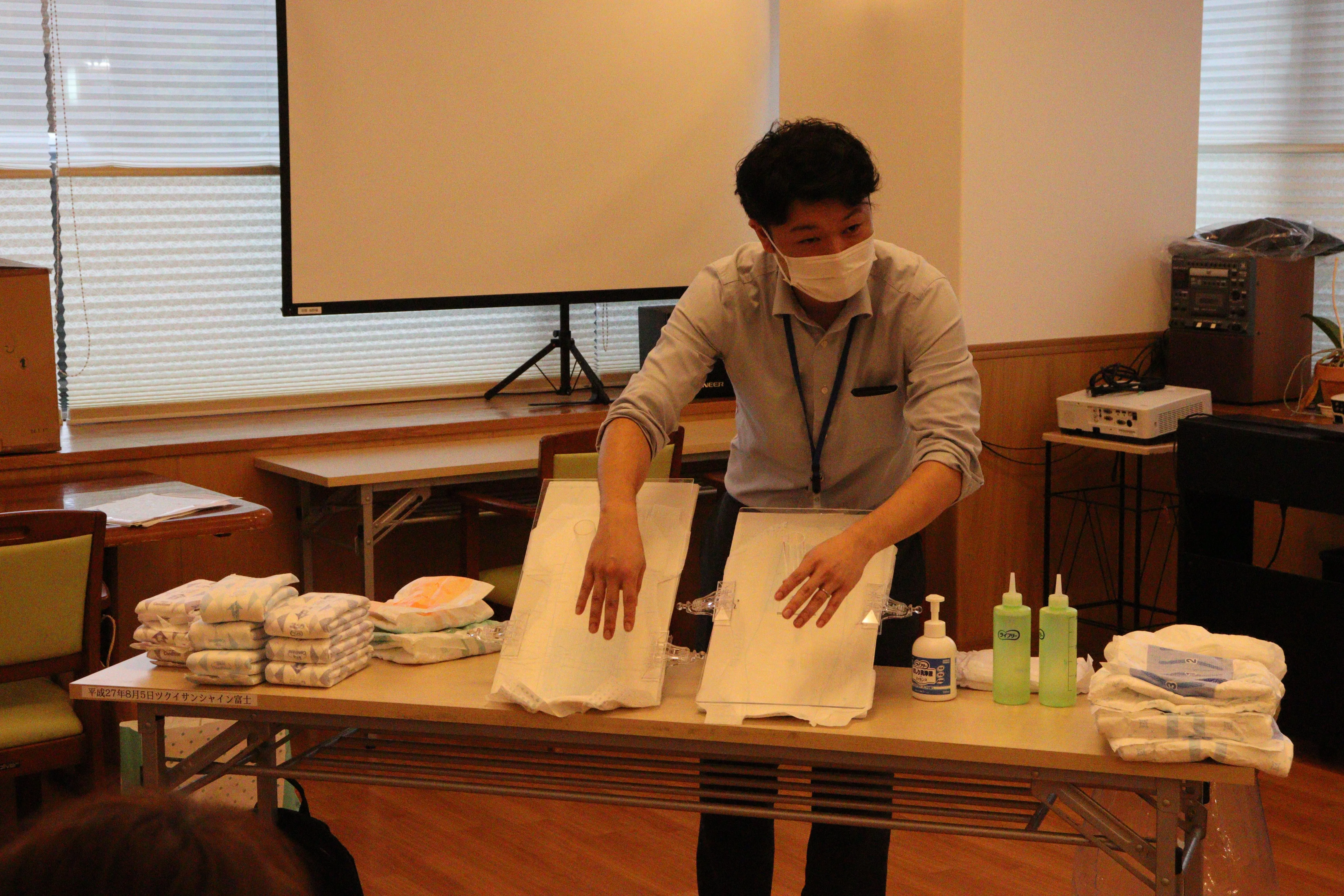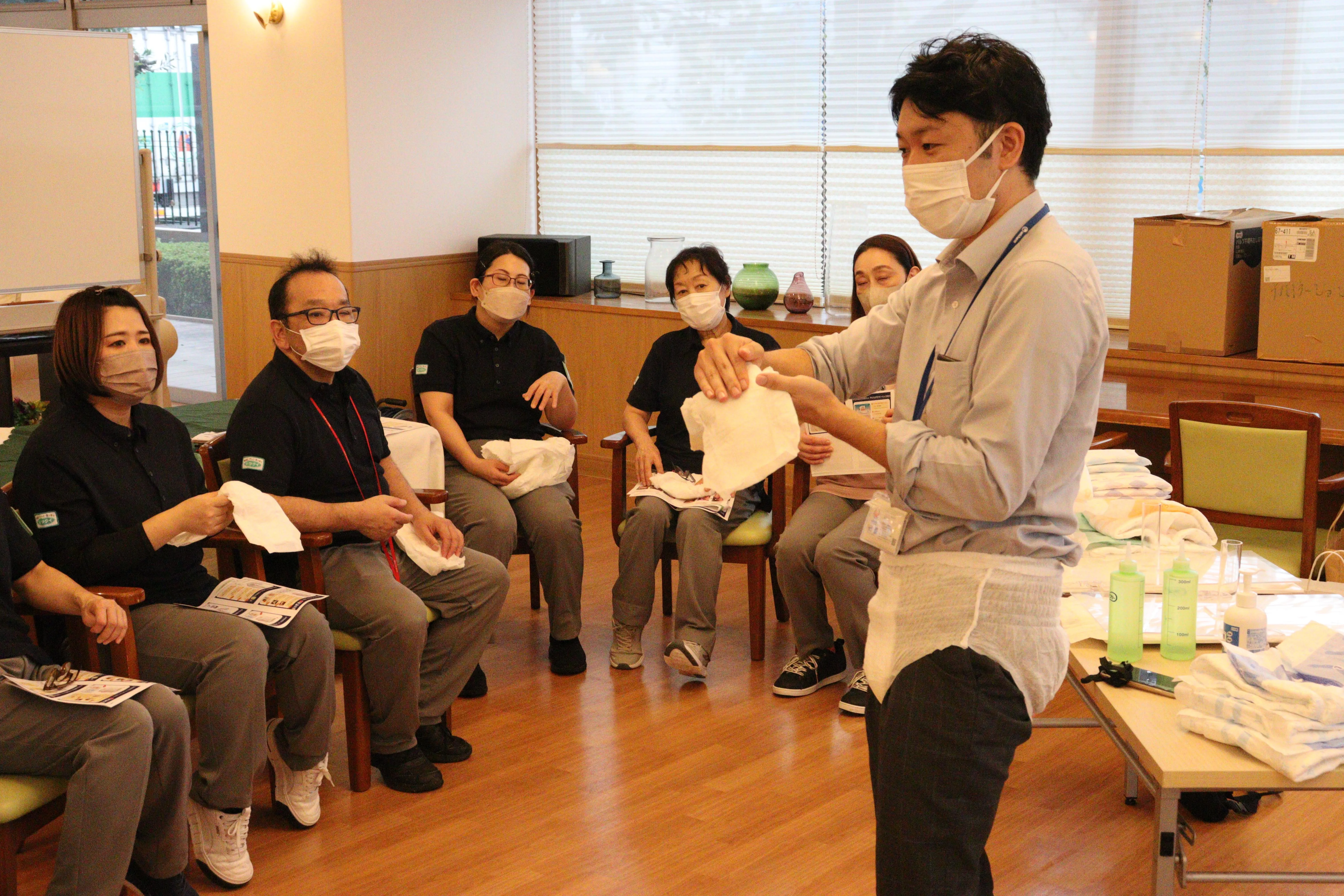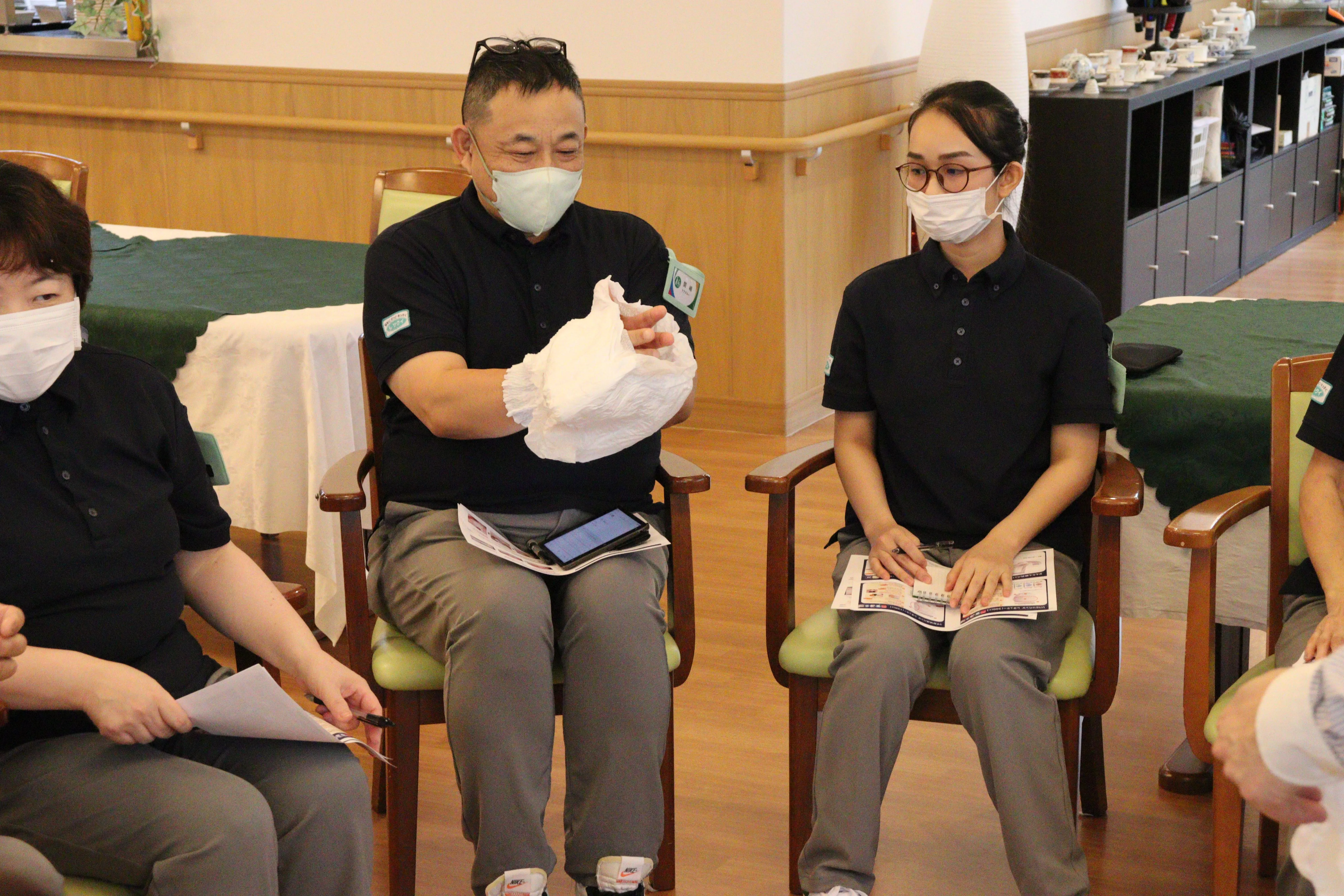 日頃、自分達が対応しているパット交換、意外と知らないことがあり、とっても勉強になりました。「パットの真ん中の薄い部分は何?」「どれぐらいの容量に対応できるのか」など、各自手に取って触れて、装着してみて、色々なことを感じ取ったと思います。