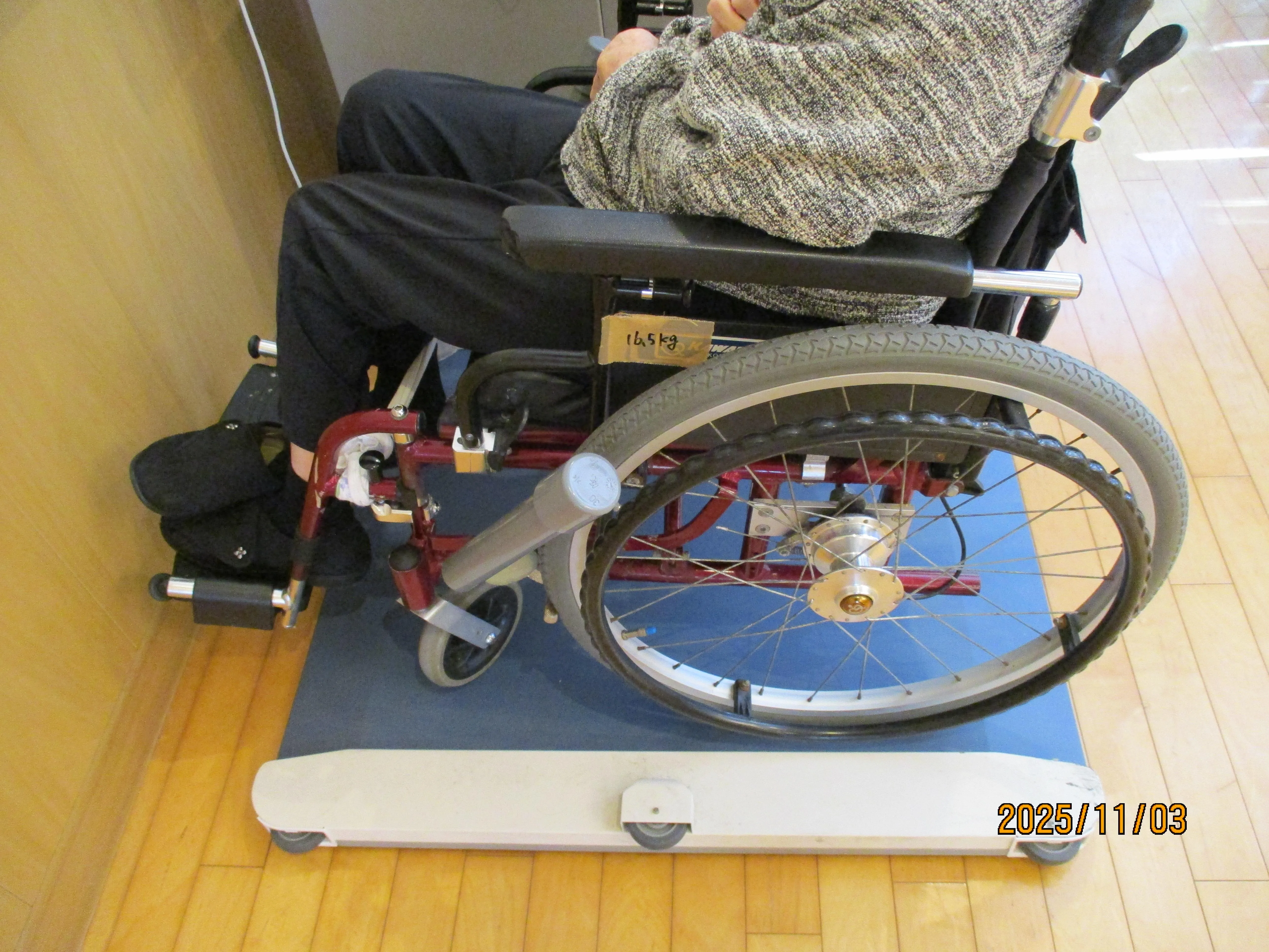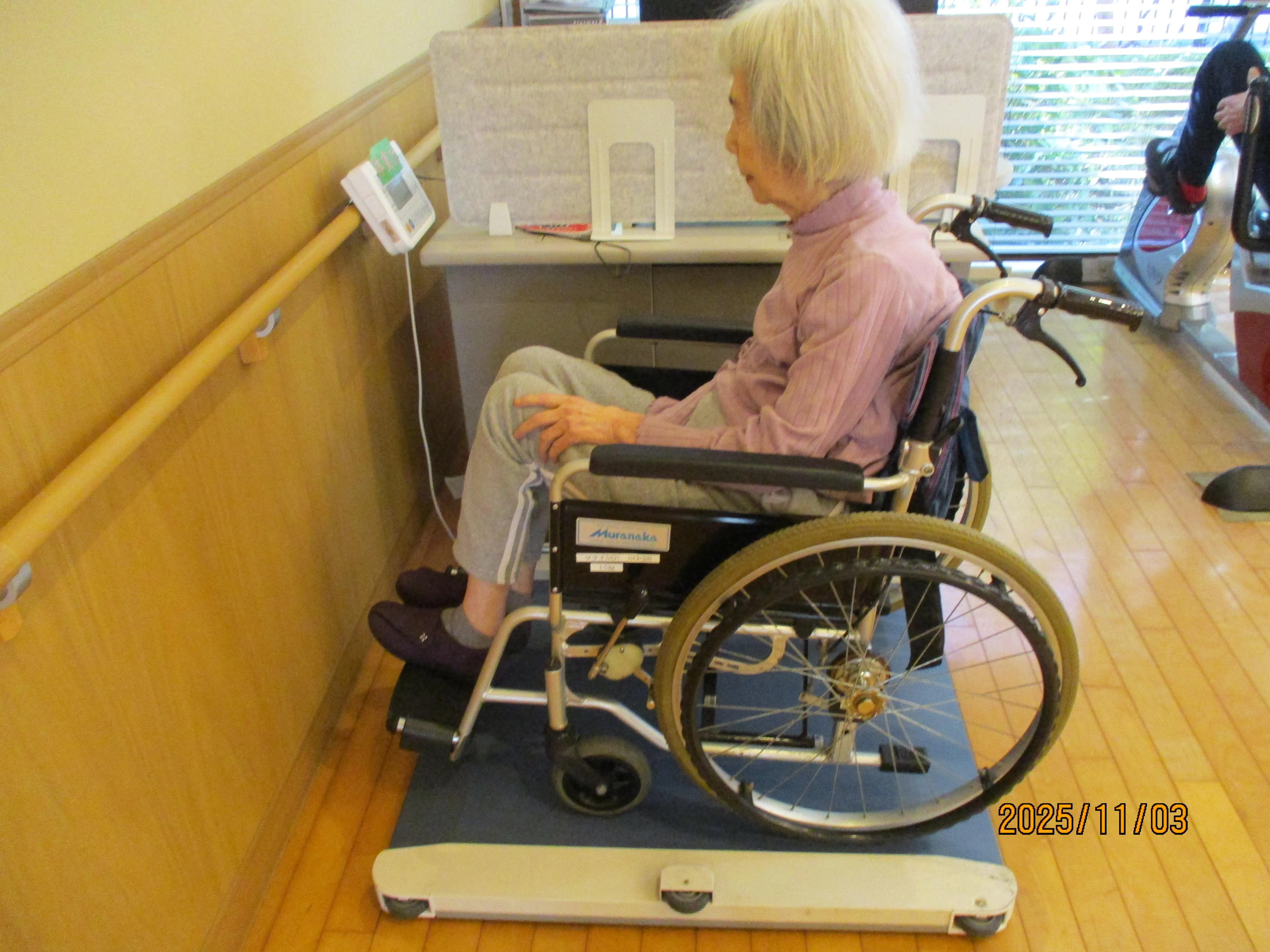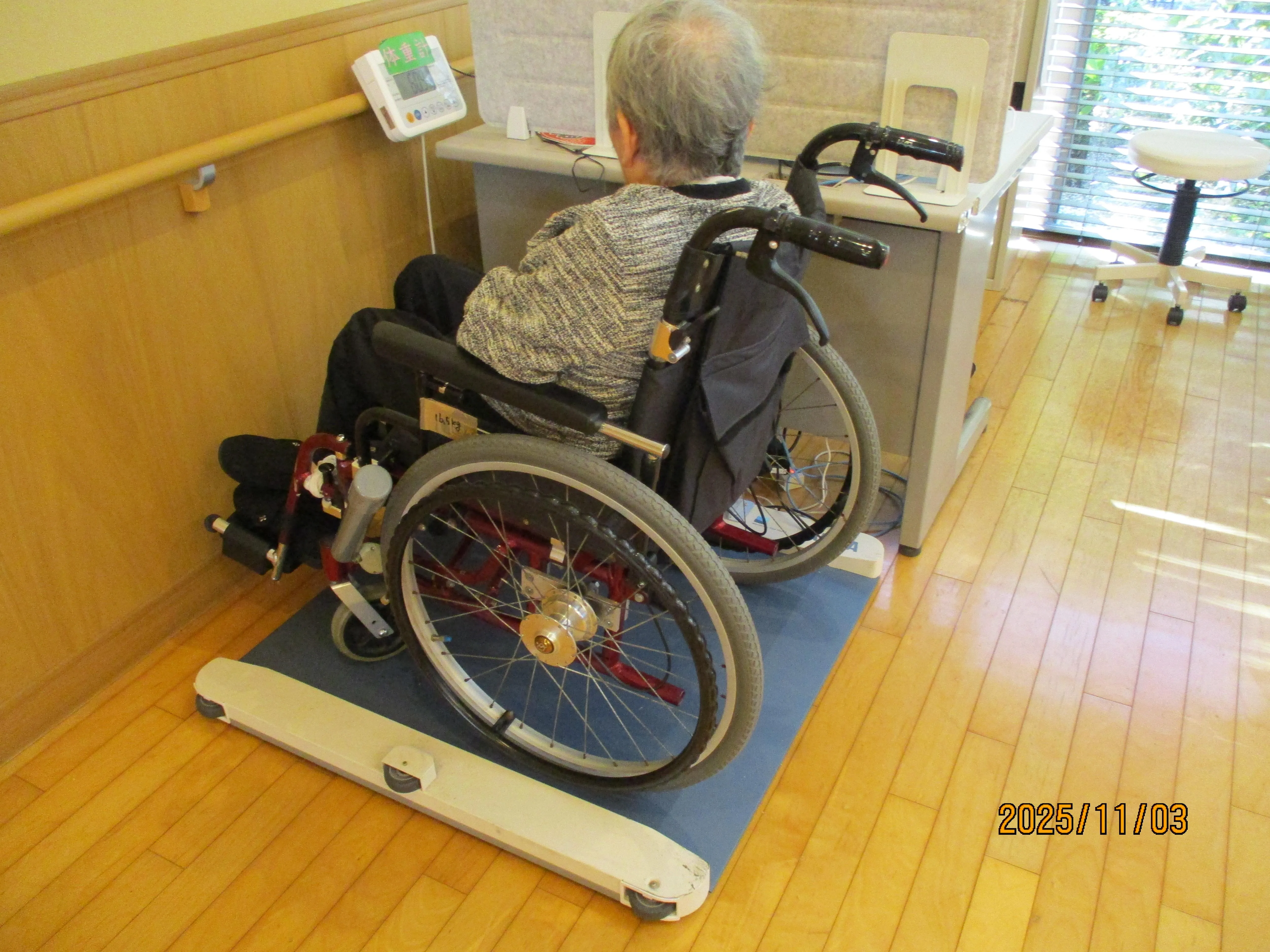 「今月も元気に過ごせましたね」とお声がけしながら、楽しく測定を進めています。車椅子をご利用の方にも安全に測定いただけるよう、専用の機器を使用するなど配慮しております。