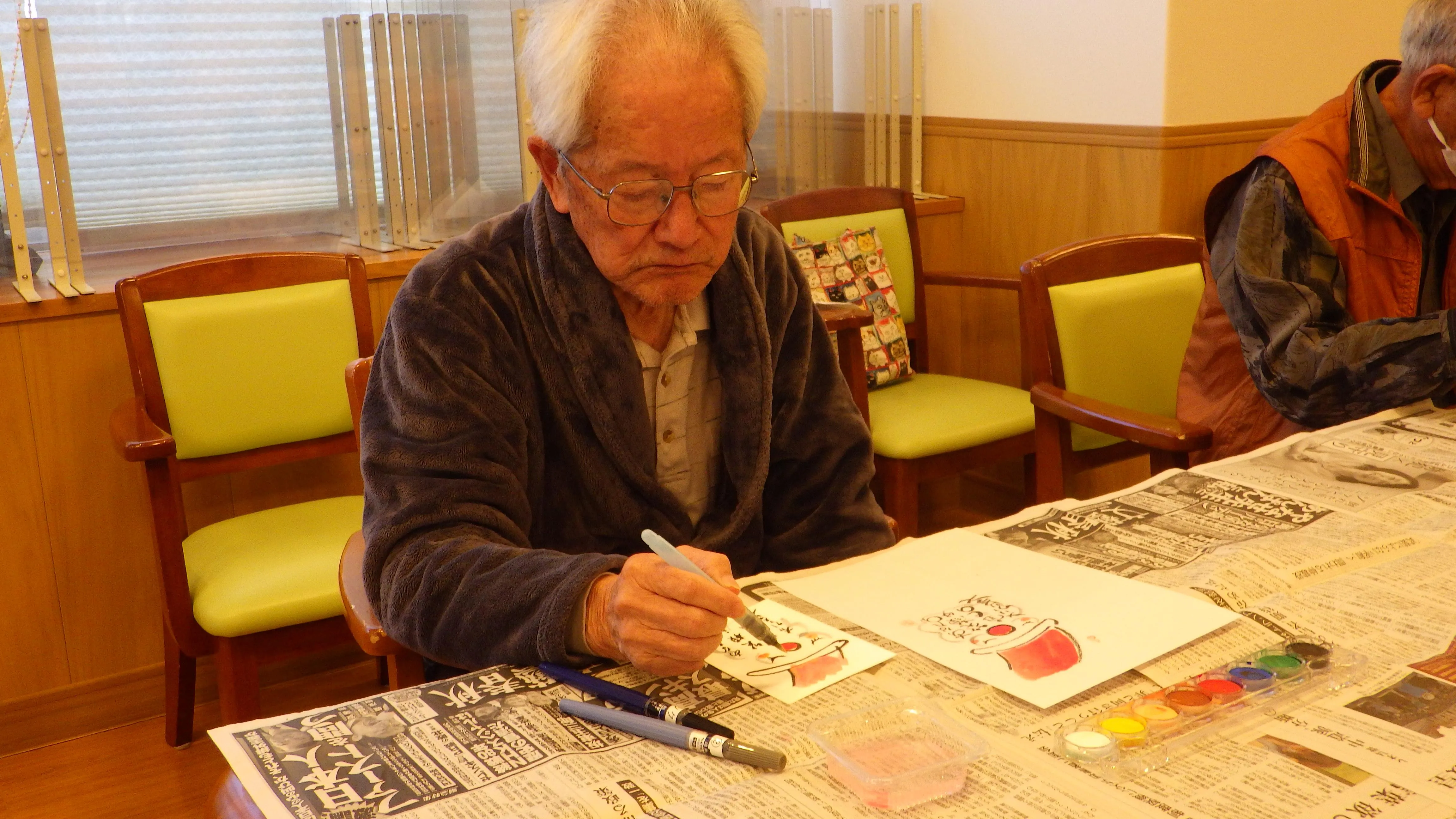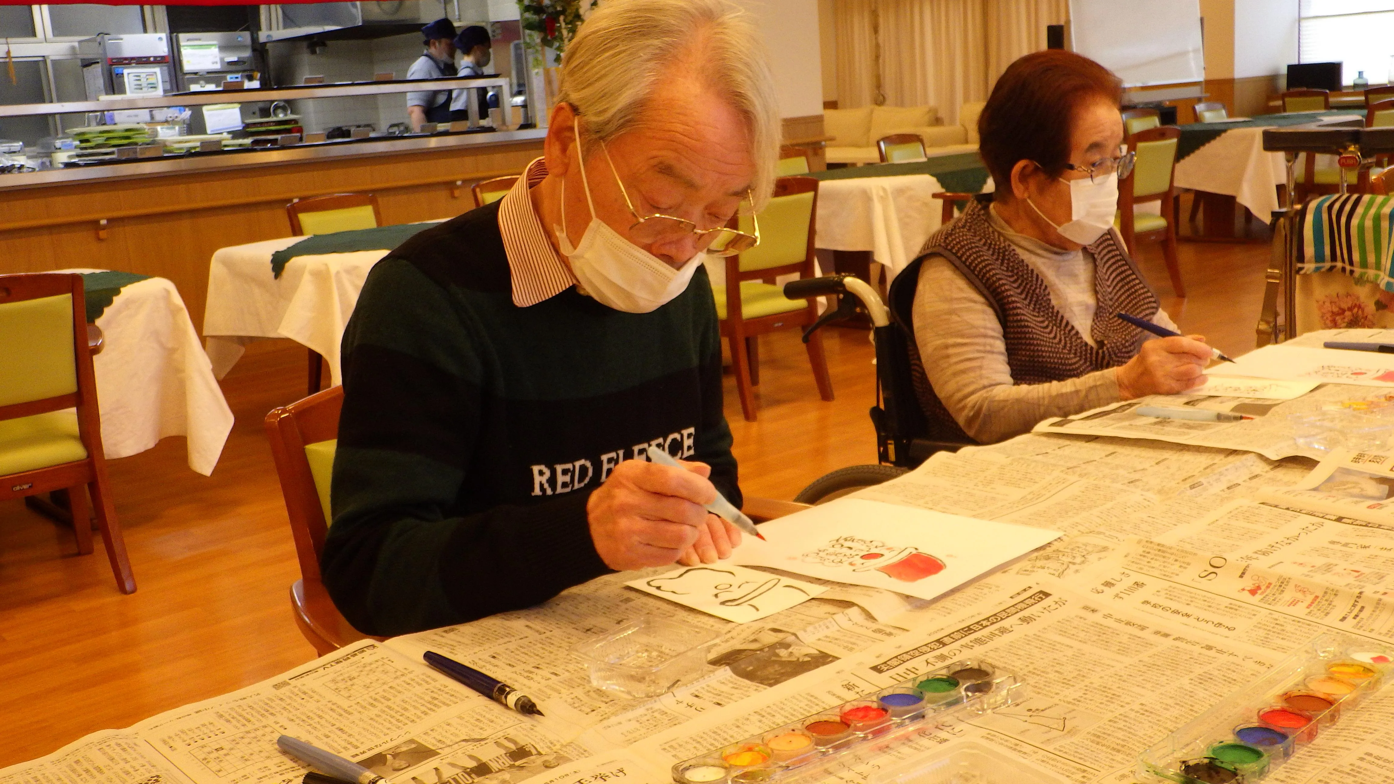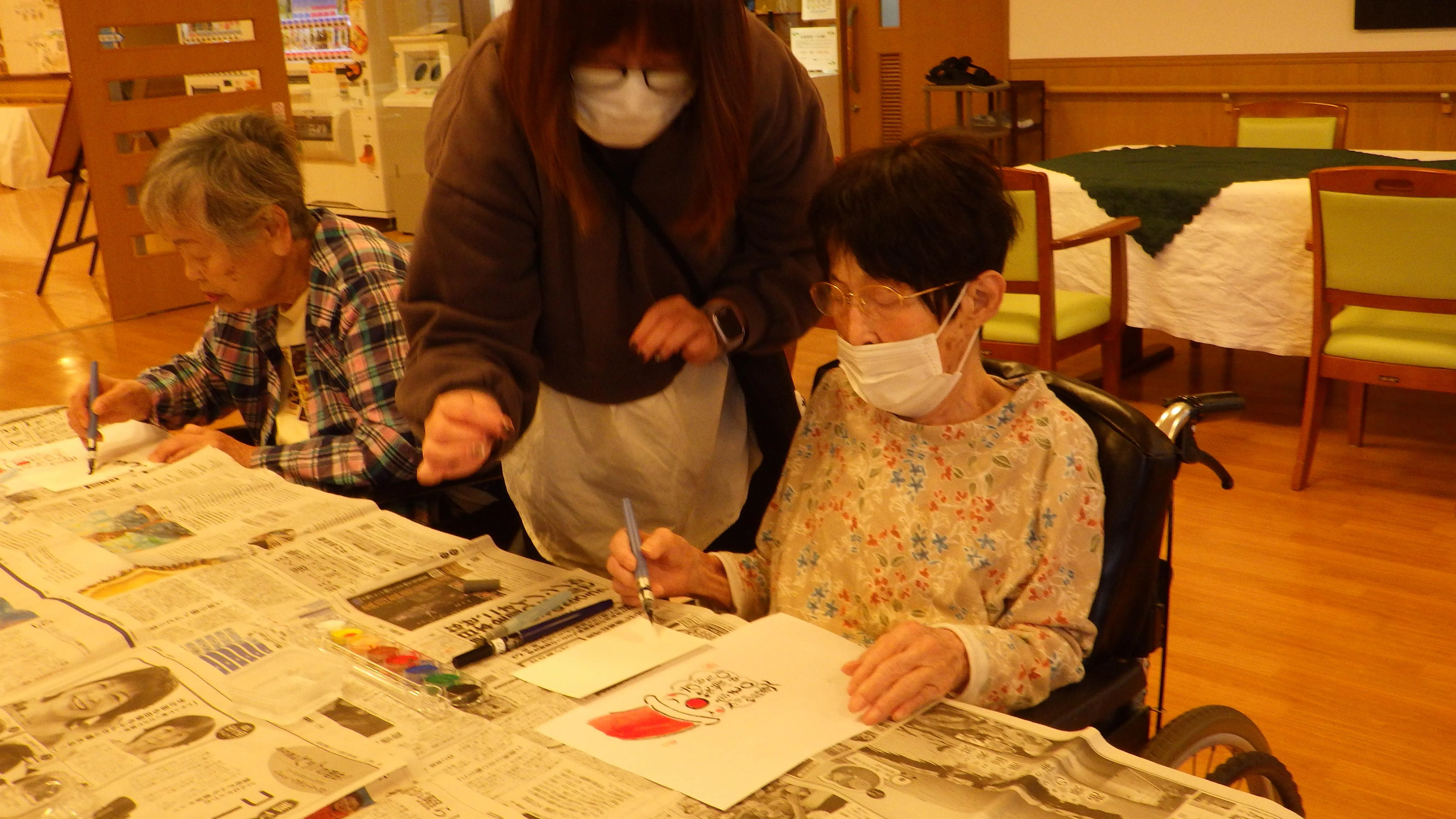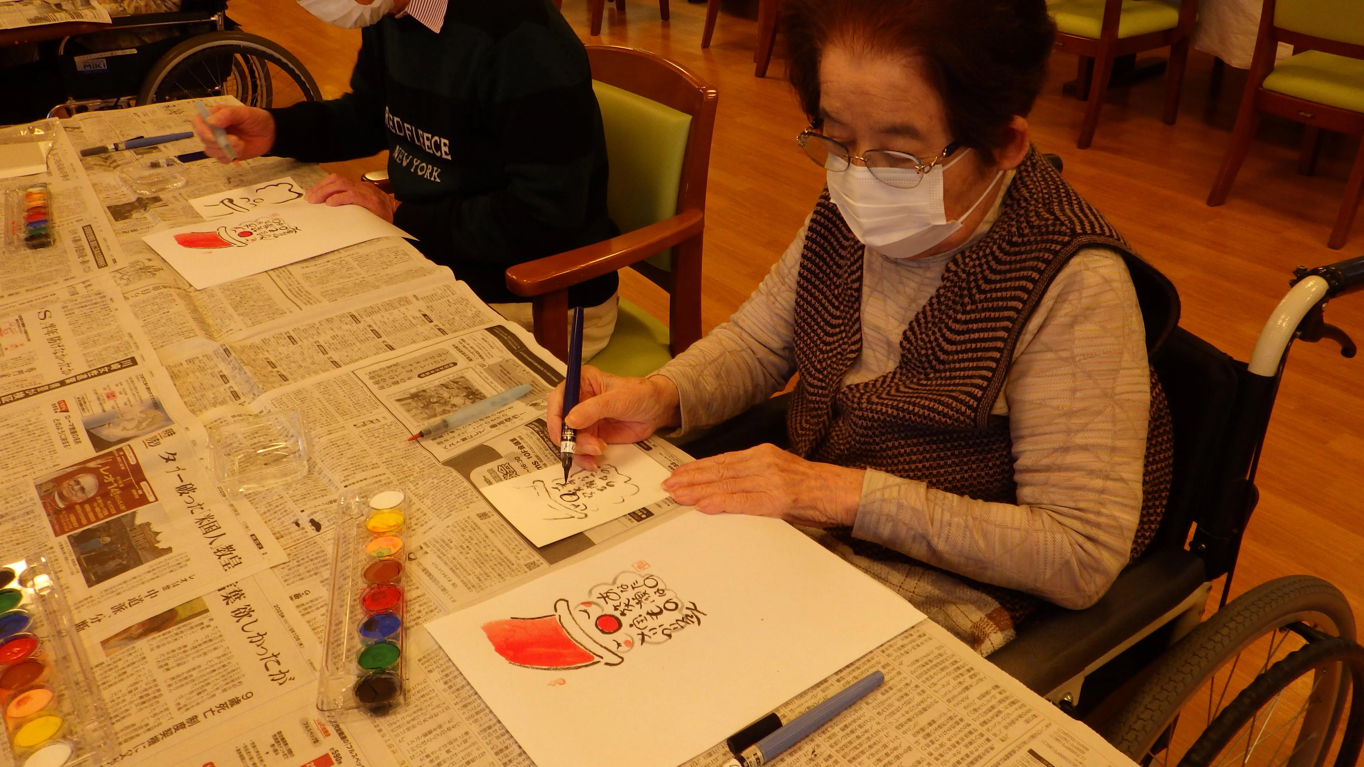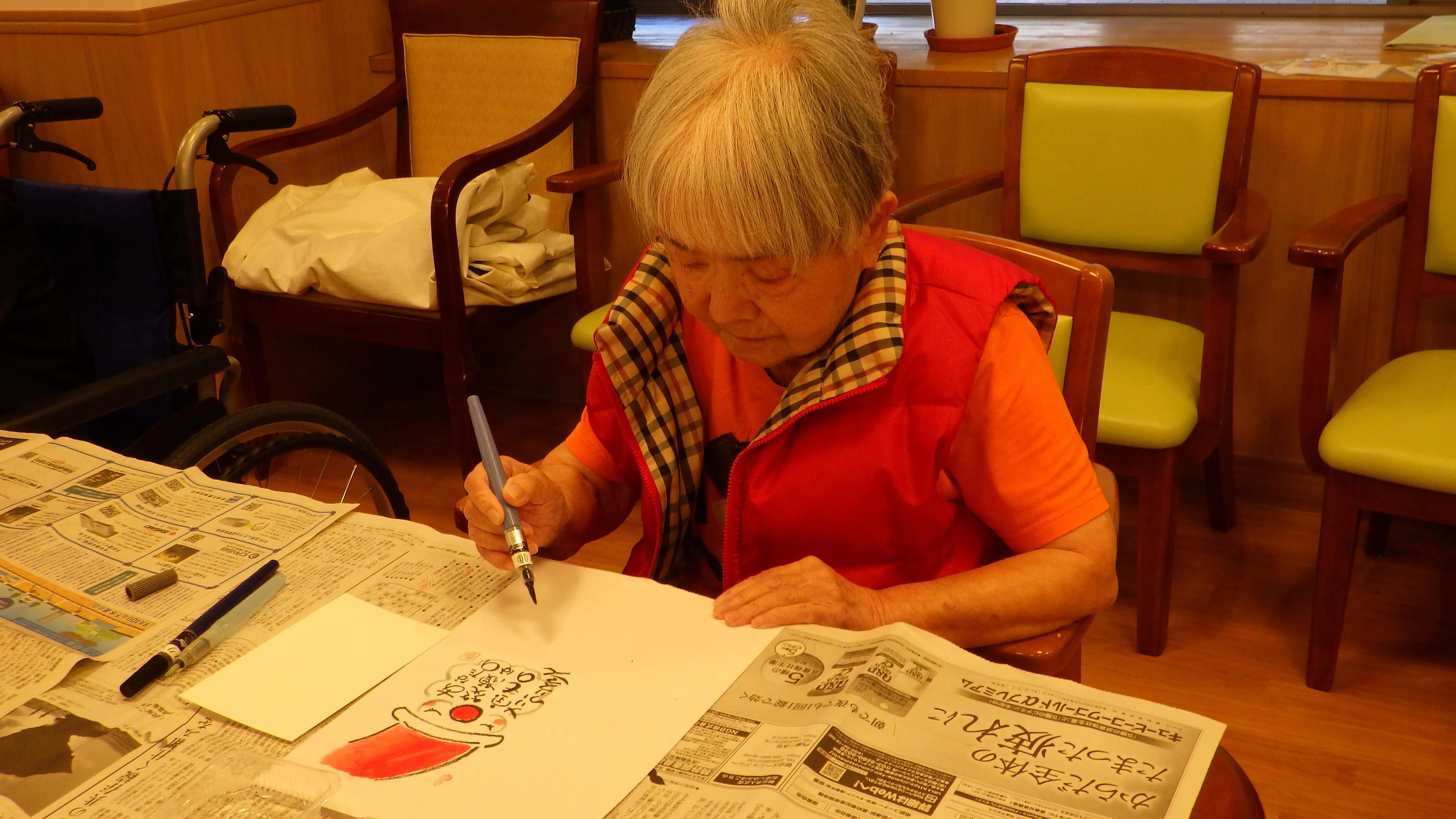 毎月、スタッフ指導のもと、お客様が見本を見ながら季節の気持ちを書で書き込まれております。いつも皆様楽しみにされており、今月はクリスマスが近いためサンタクロースが描かれておりました。クリスマスにプレゼントが届くのかな~なんて思い楽しみに、より気持ちがこもっておりました。