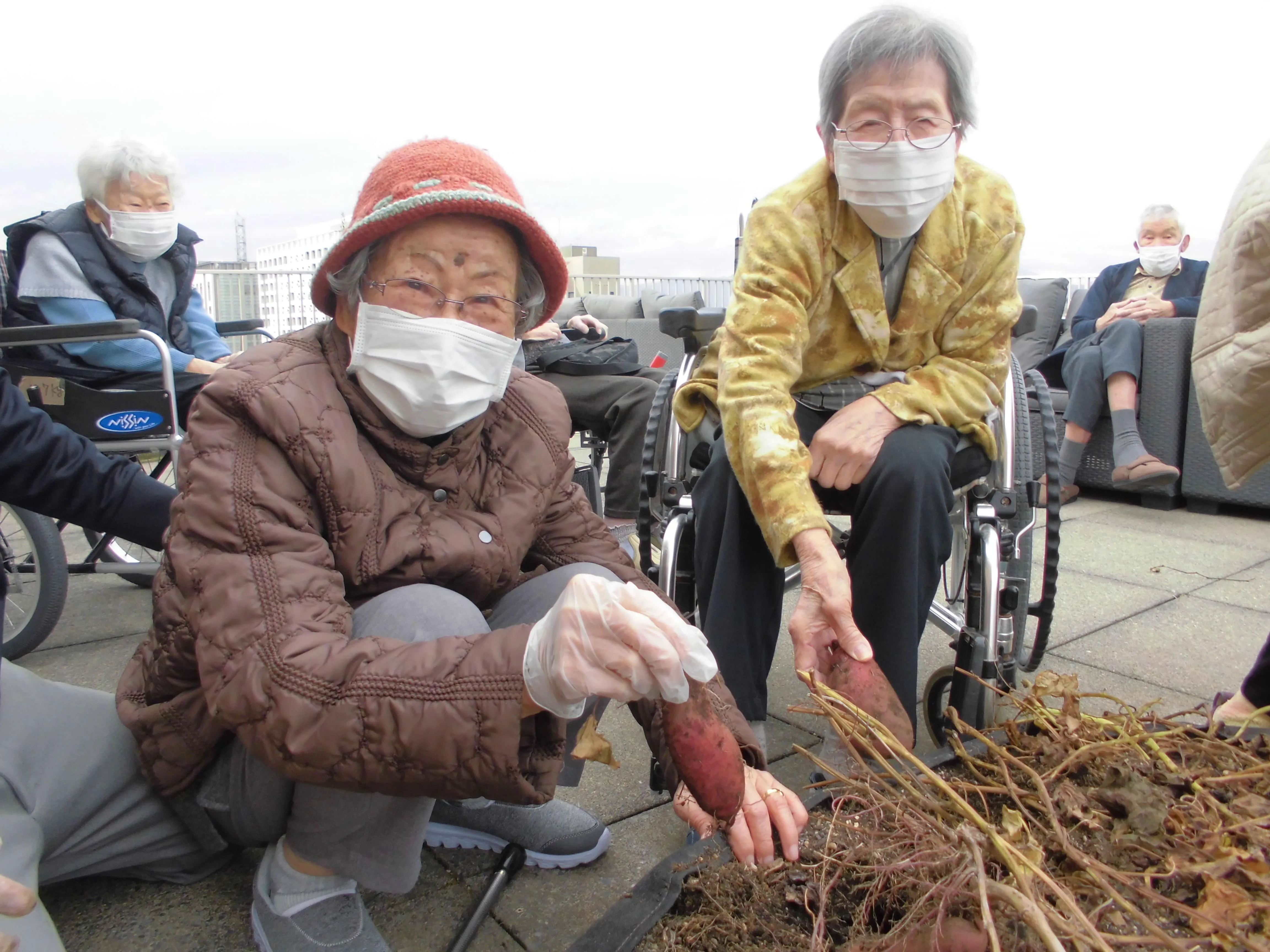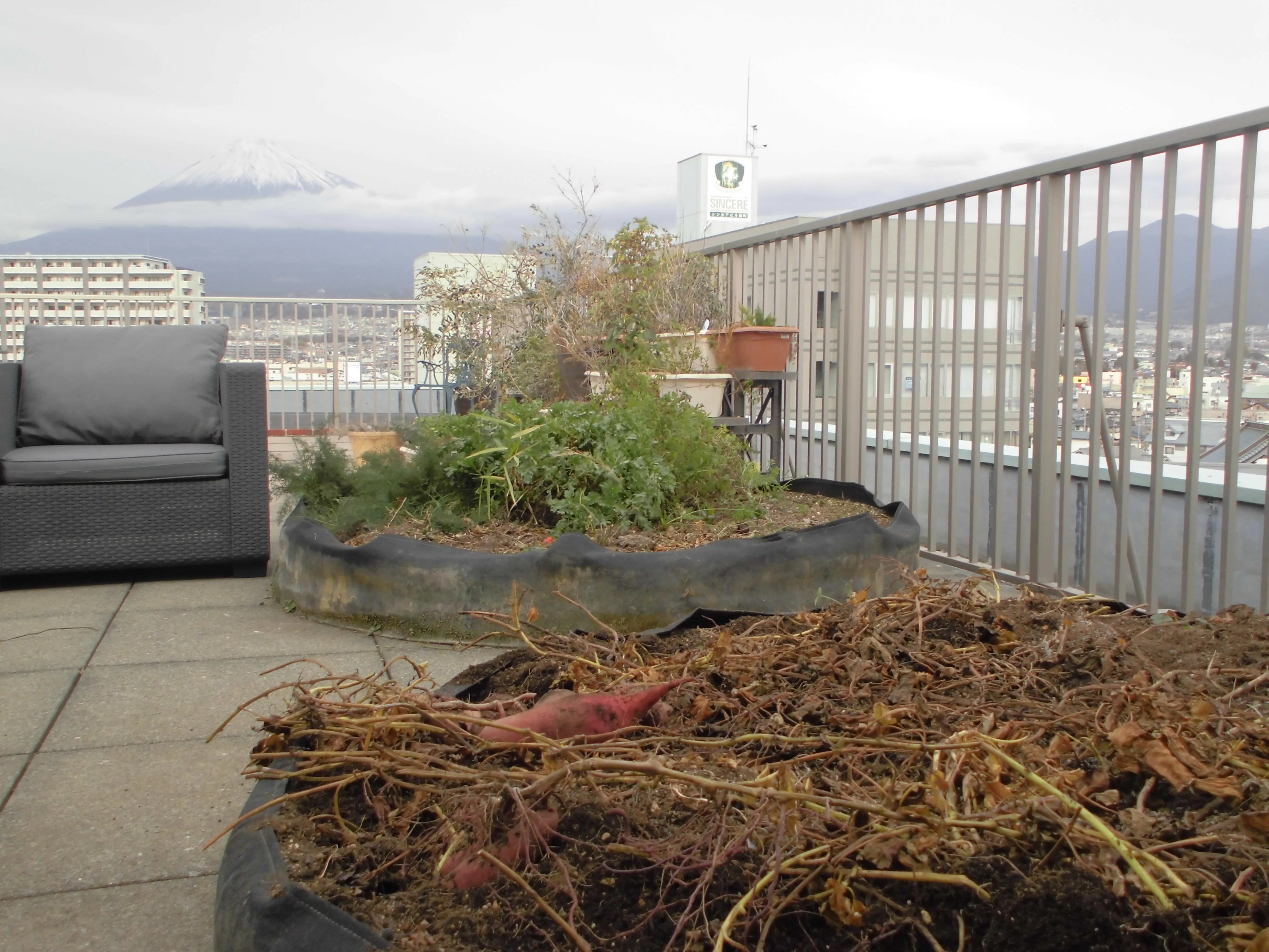 ツクイ・サンシャイン富士の屋上には菜園があり、さらにはサツマイモ畑もあります。