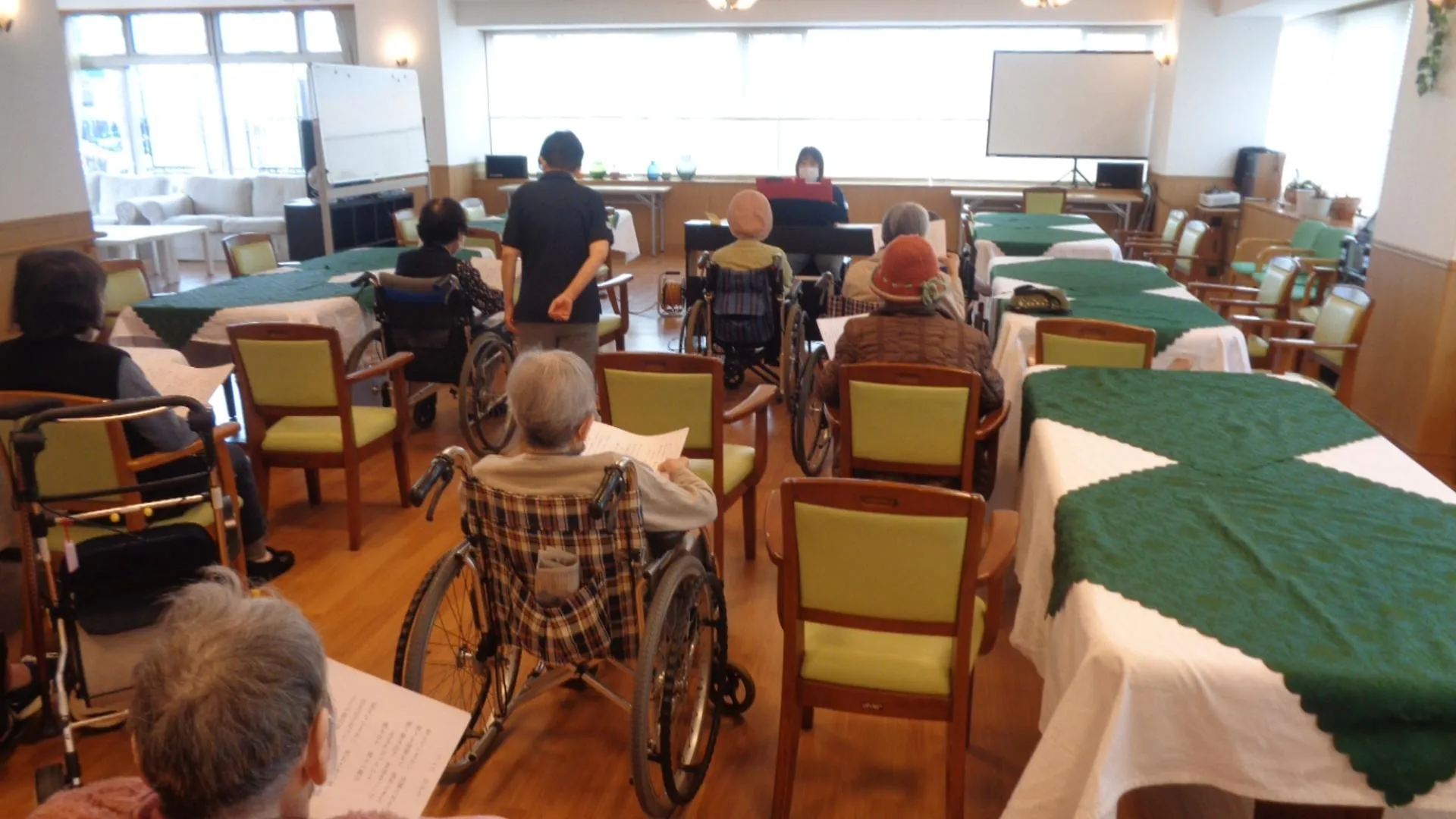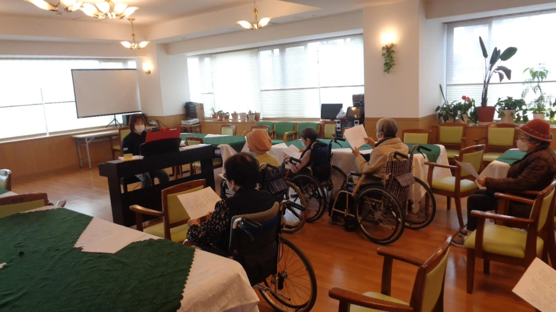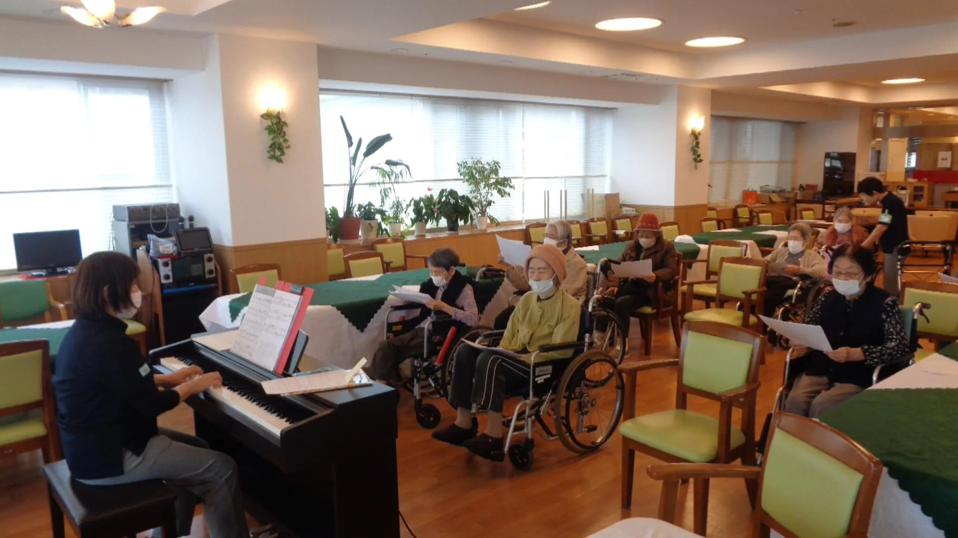 スタッフと懐メロを歌う、歌レクリエーションが開催されました。音色に合わせて、皆さん楽しそうに歌われていましたよ。次回も参加してください。