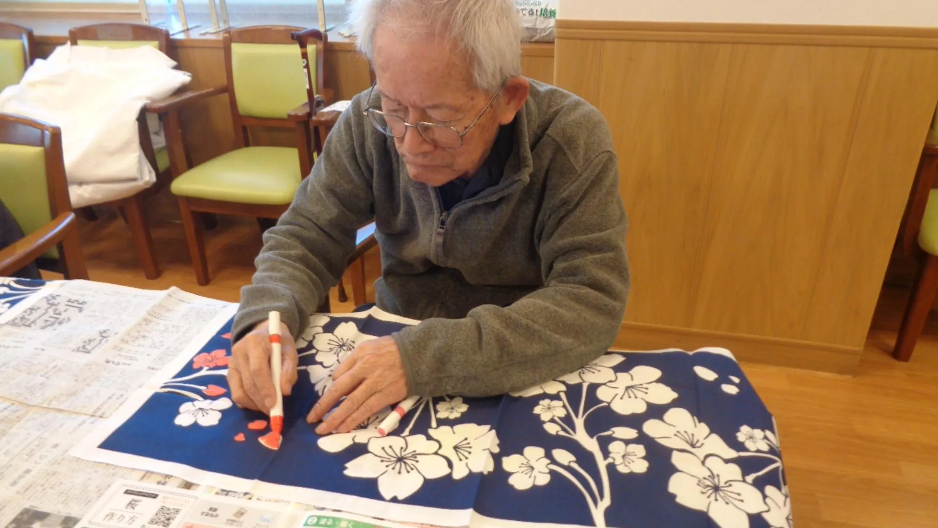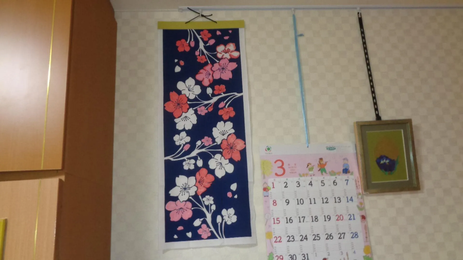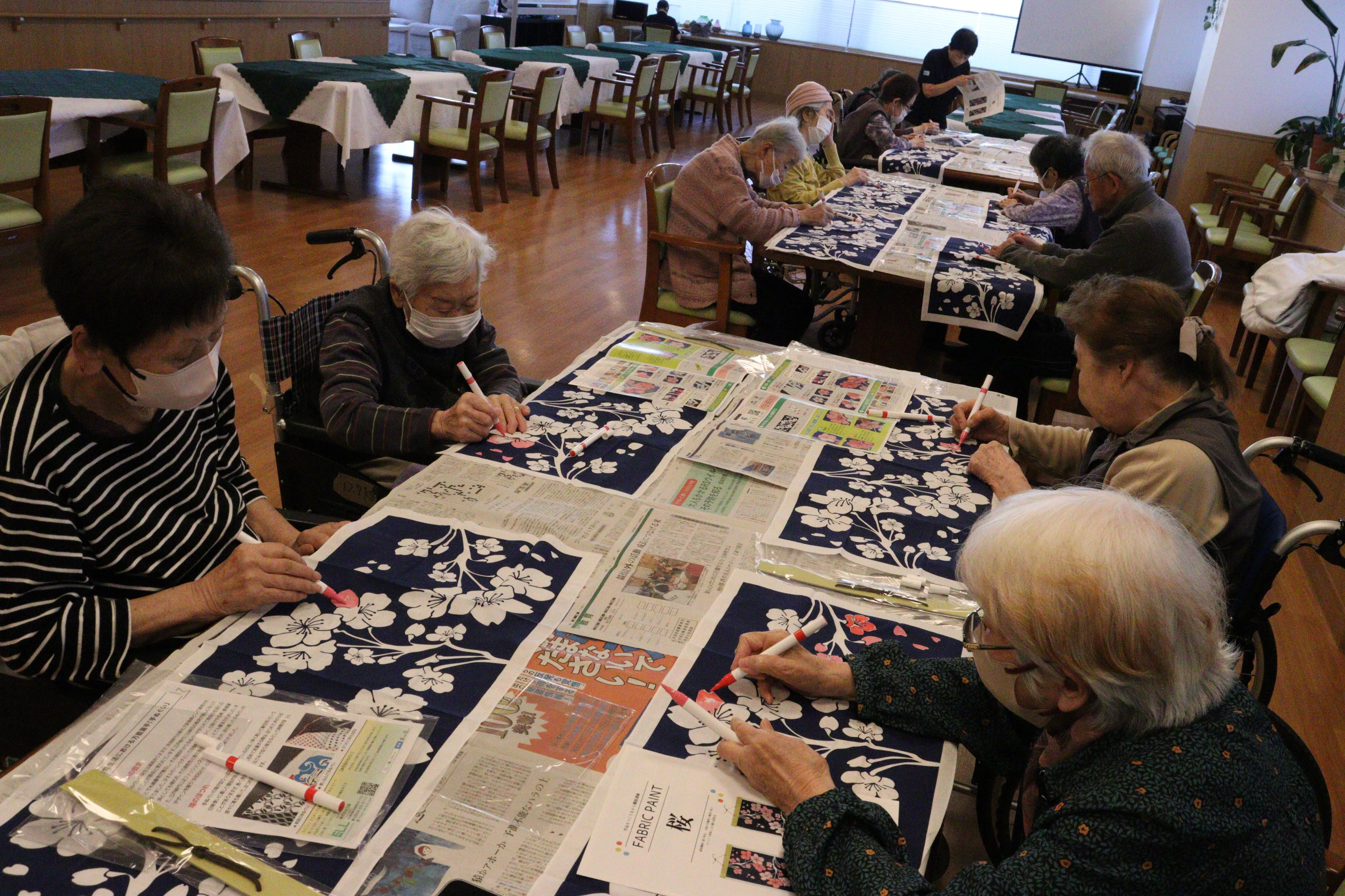 桜の手ぬぐいのタペストリー作り、皆様それぞれの桜をはみ出ないように、丁寧に色付けしていました。早速出来たタペストリーを居室に飾っていました。