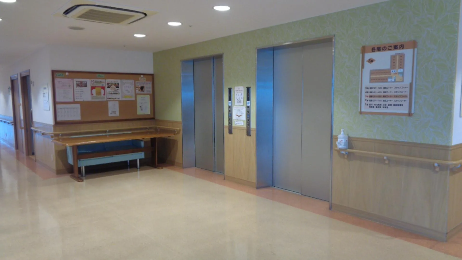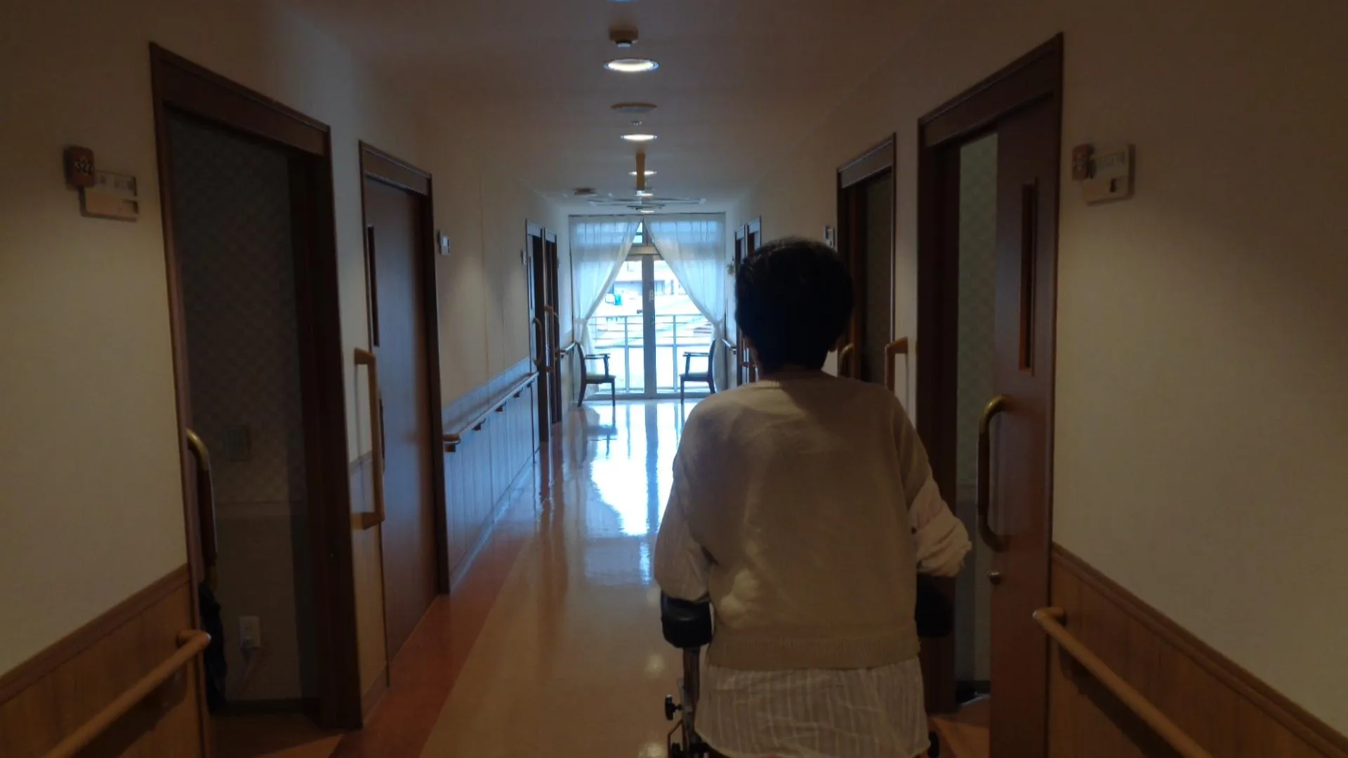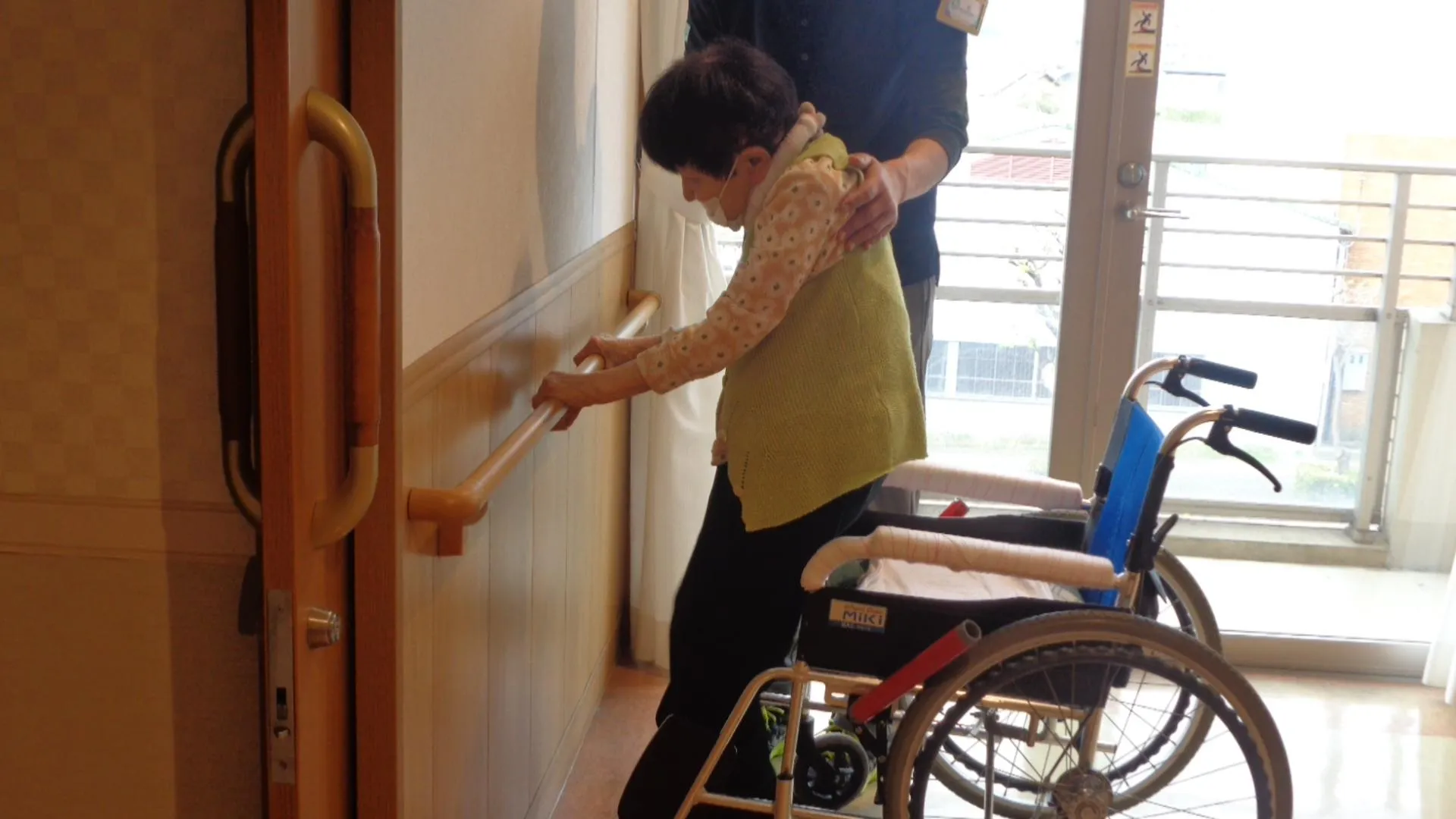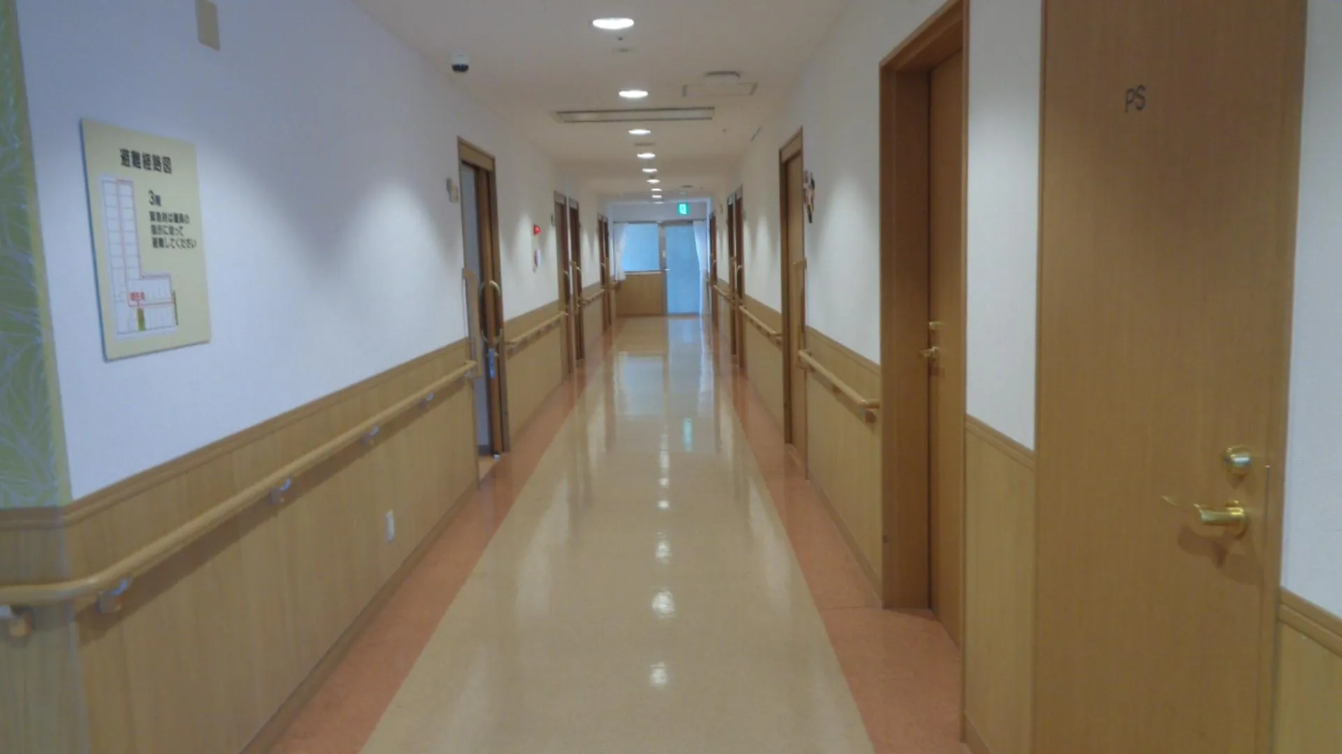 私たちの施設は、フロアや廊下の形は同じです。お客様は日々、車椅子で自走したり歩行器使って歩行したりしています。また機能訓練士と一緒に筋力アップのために、手すりを使って足踏みしています。窓から富士山が綺麗に見えています。